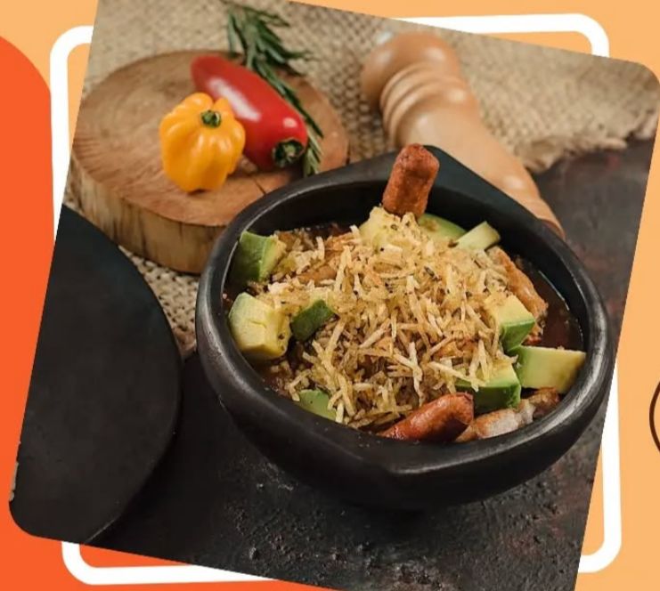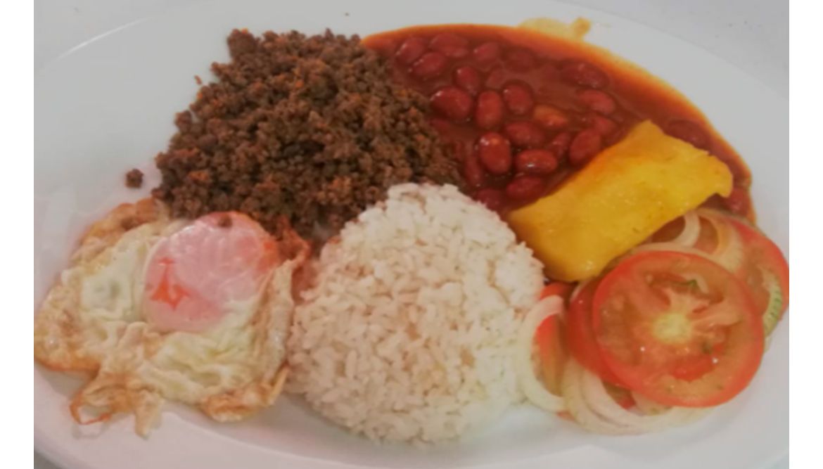 Cazuela de frijoles, acompañado con arroz blanco, papa ripio, frijoles, carne molida, chorizo, chicharrón, ensalada y aguacate.