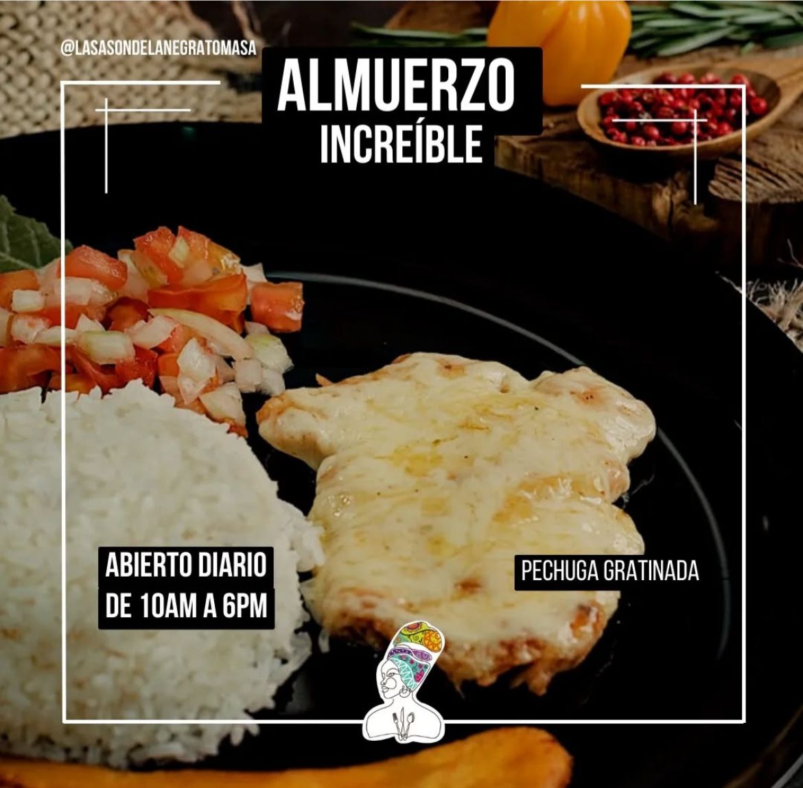 Pechuga gratinada, acompañada con arroz blanco o arroz de coco, tajada o patacón, papas francesas, ensalada y una sopa a elección (consomé de pescado, frijol o sopa del día).