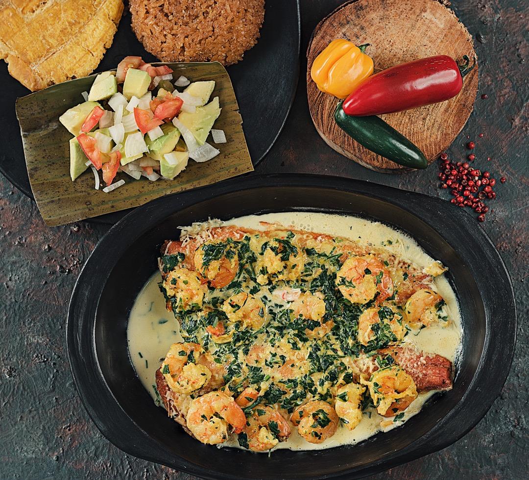 Trucha gratinada, con camarones, acompañada con arroz blanco o arroz de coco, patacón, ensalada, aguacate y consomé de pescado.