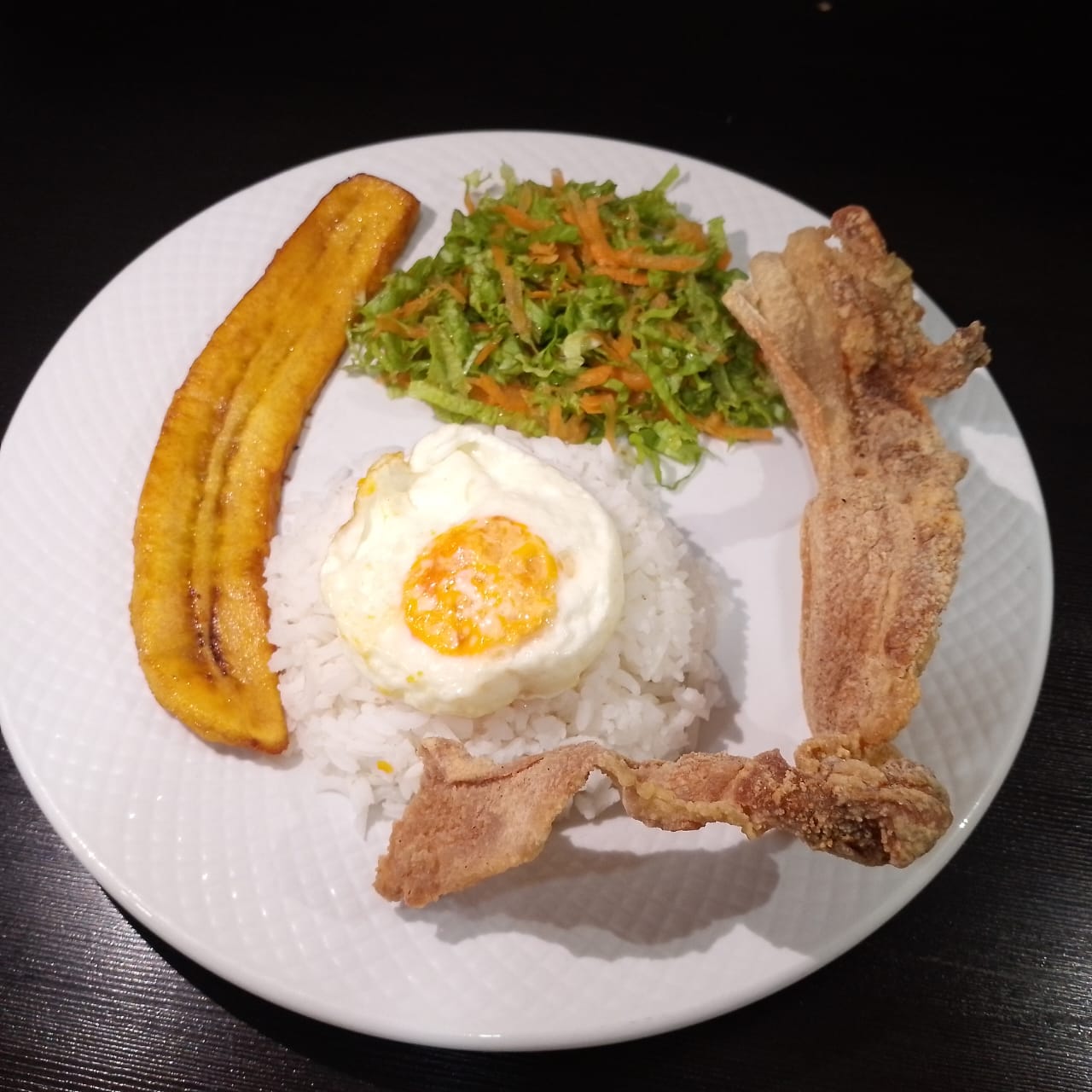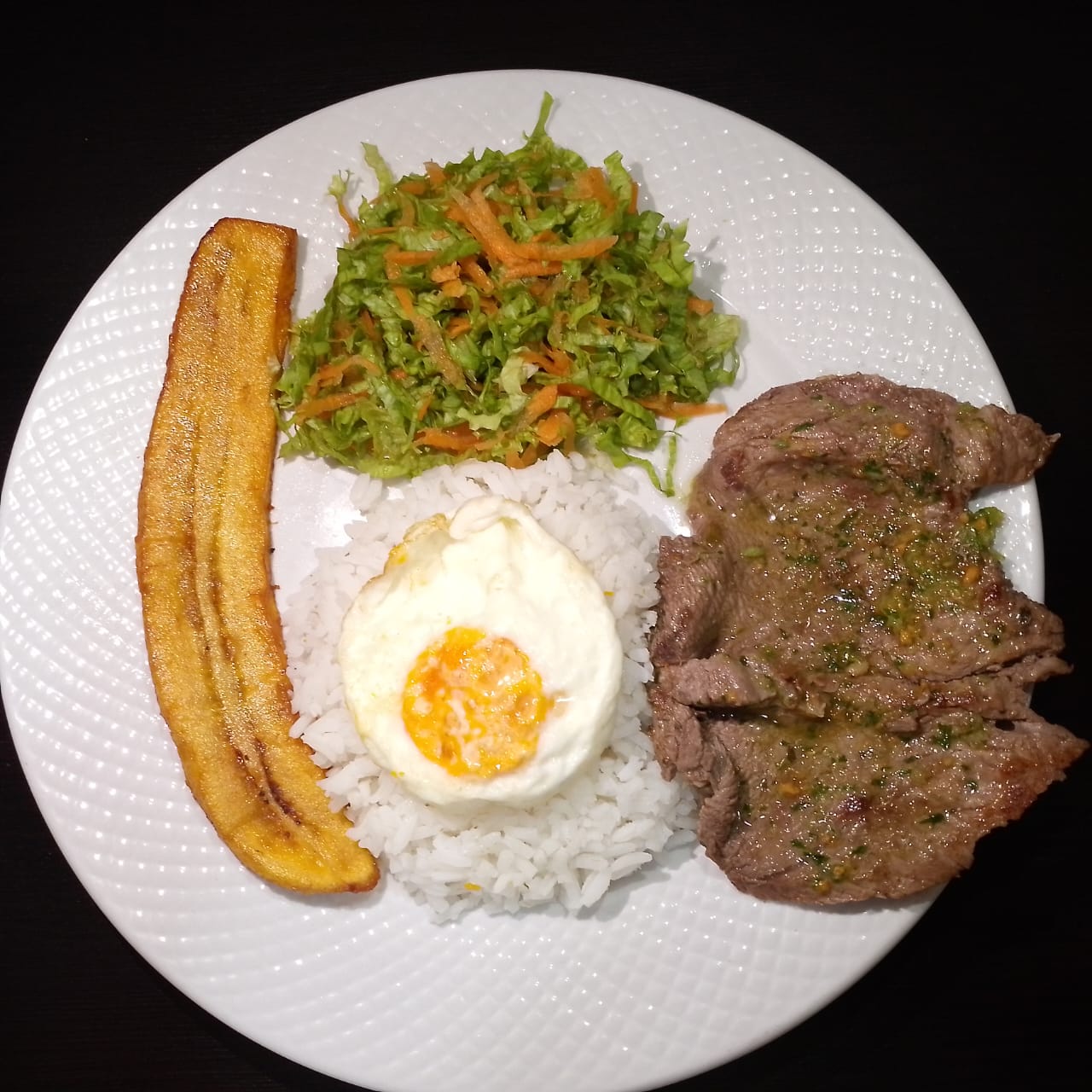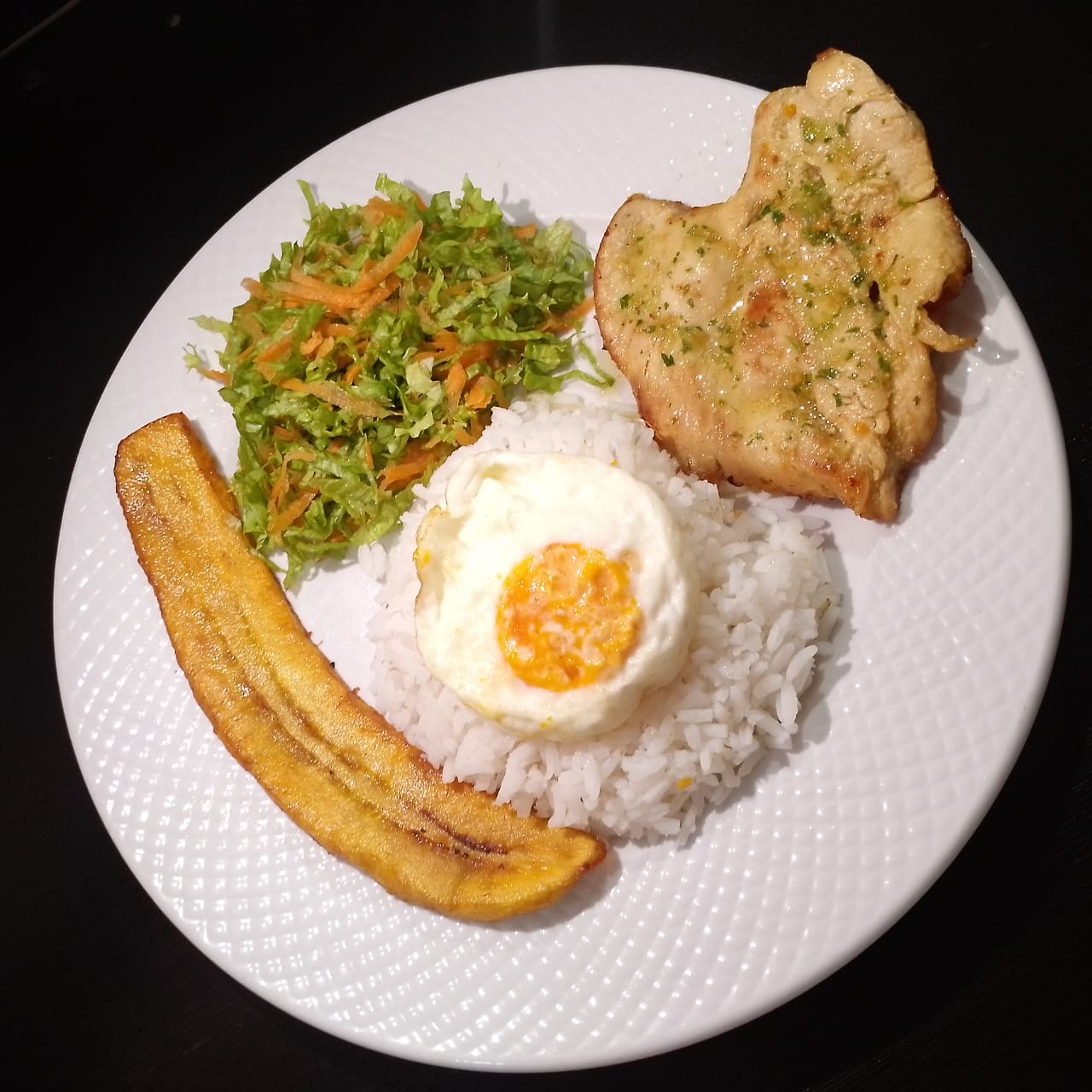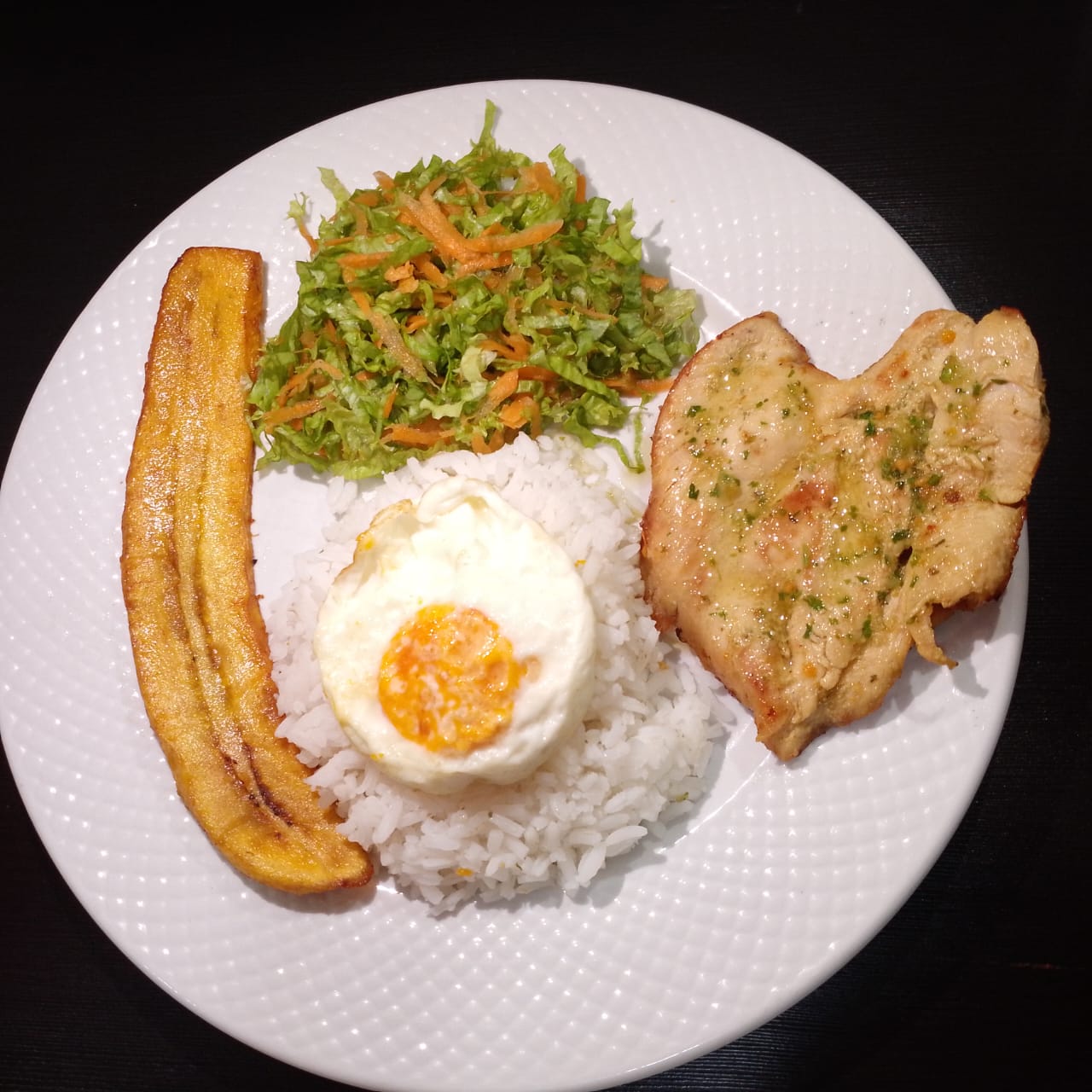 Acompañado de arroz blanco, tajada de maduro, ensalada del día y huevo frito.
