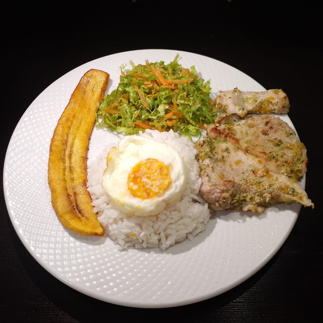 Cerdo acompañado de arroz blanco, tajada de maduro, ensalada del día y jugo del día.