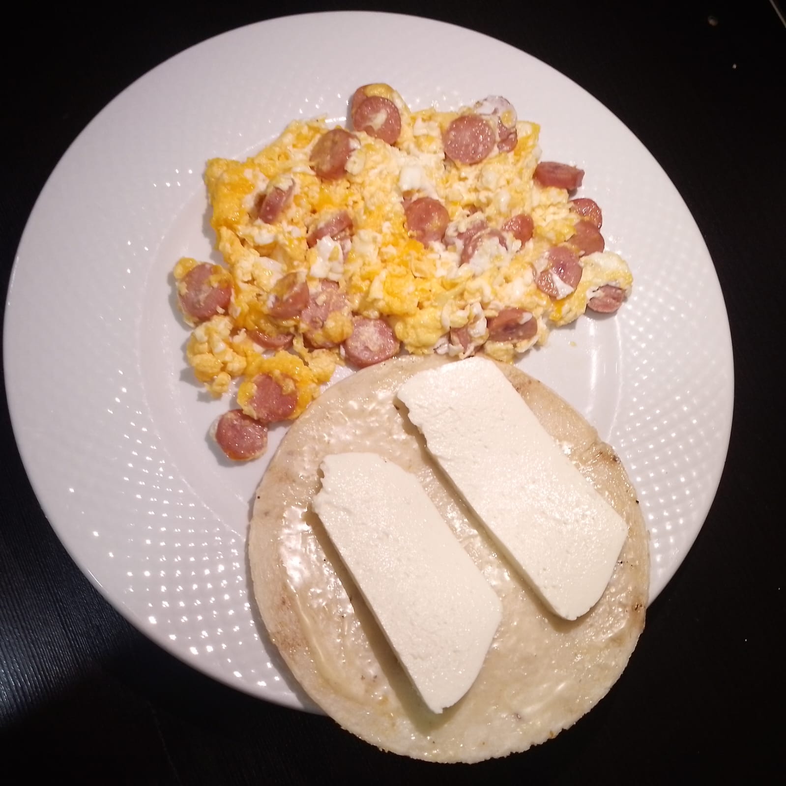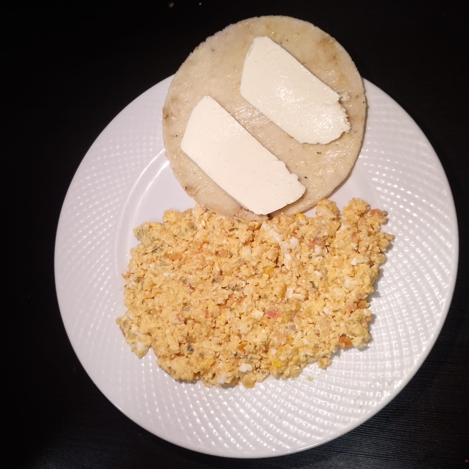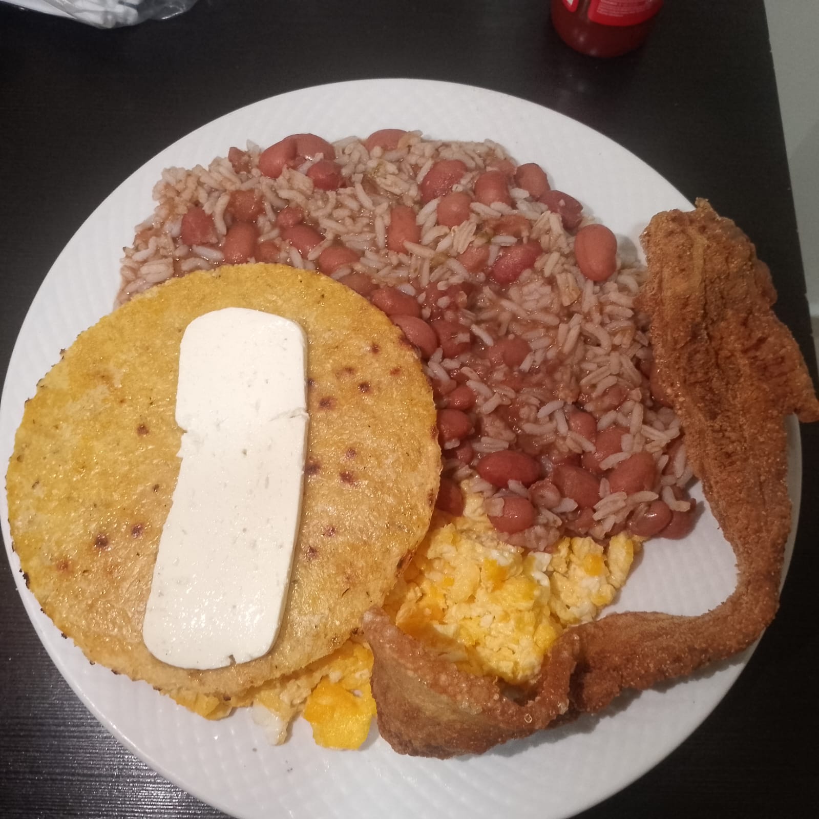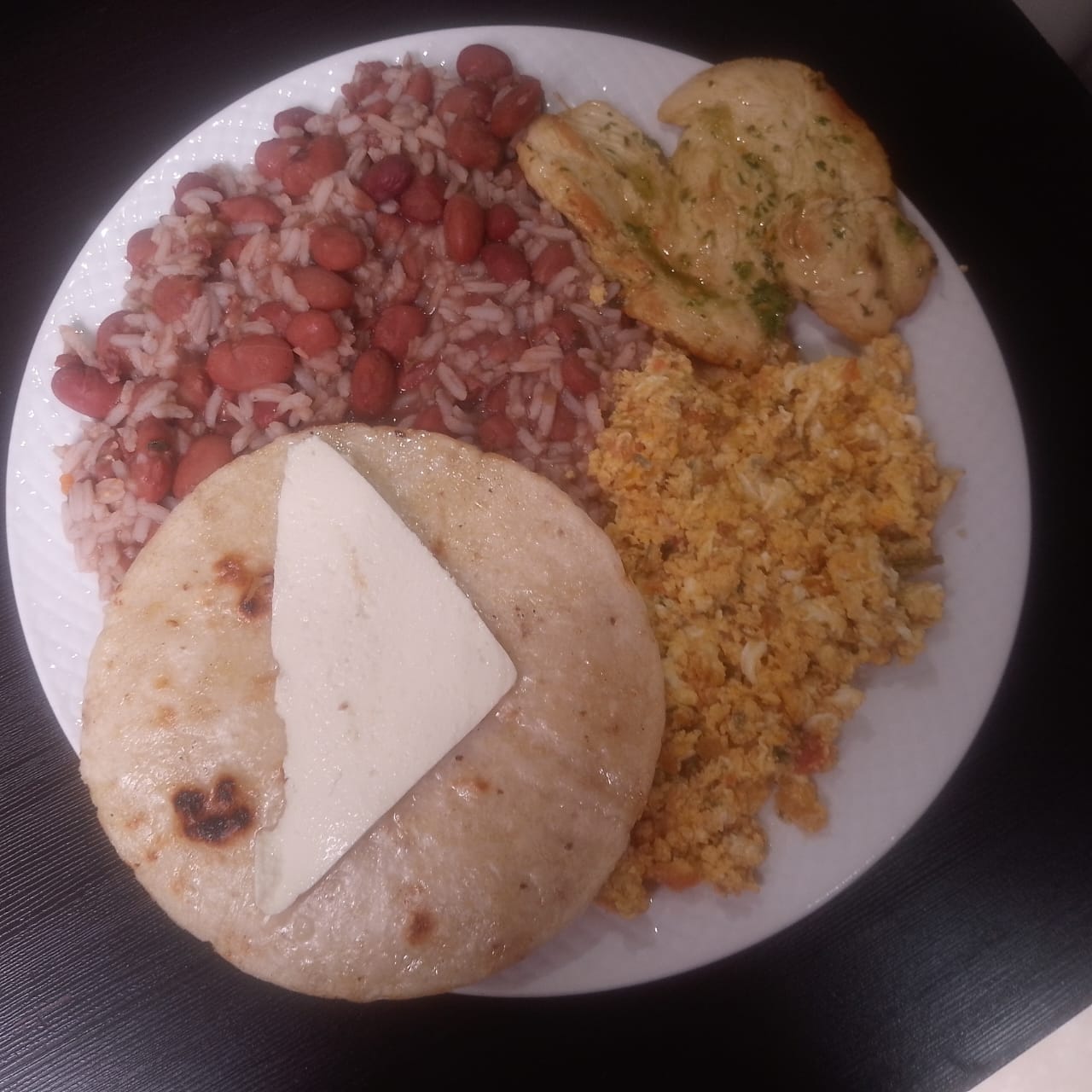 Frijoles revueltos con arroz, huevos revueltos, arepa, queso y chocolate.