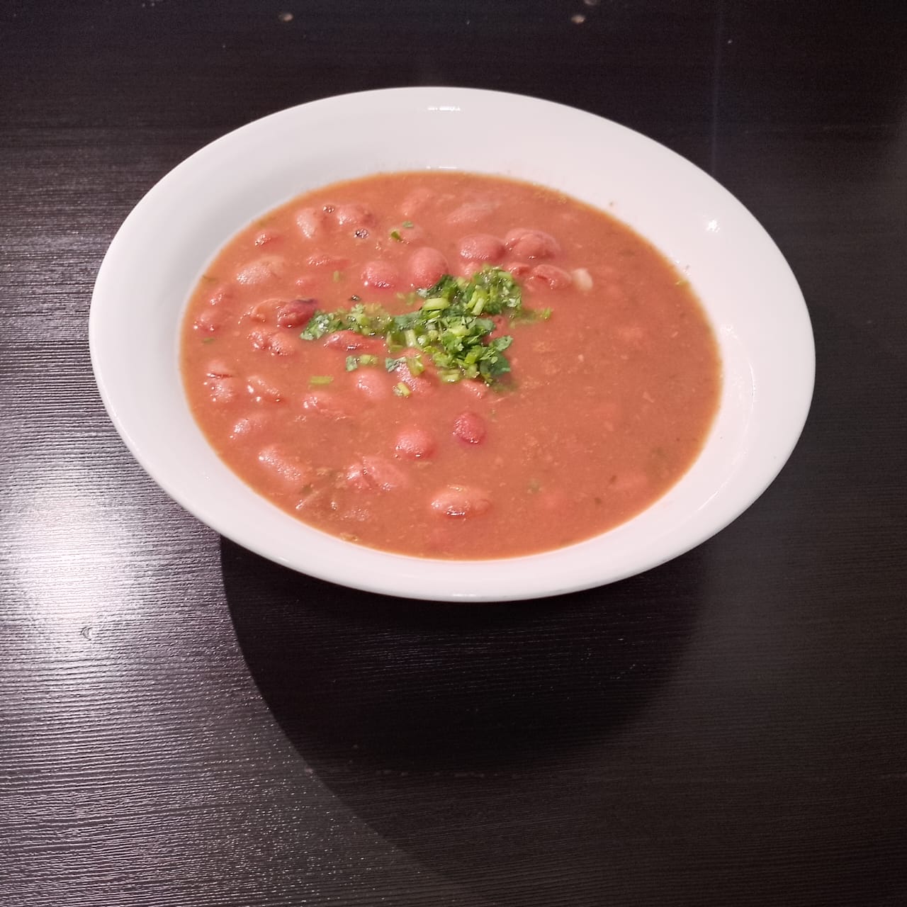 Frijoles revueltos con arroz, huevo revuelto sin aliños, arepa, queso y chocolate.