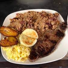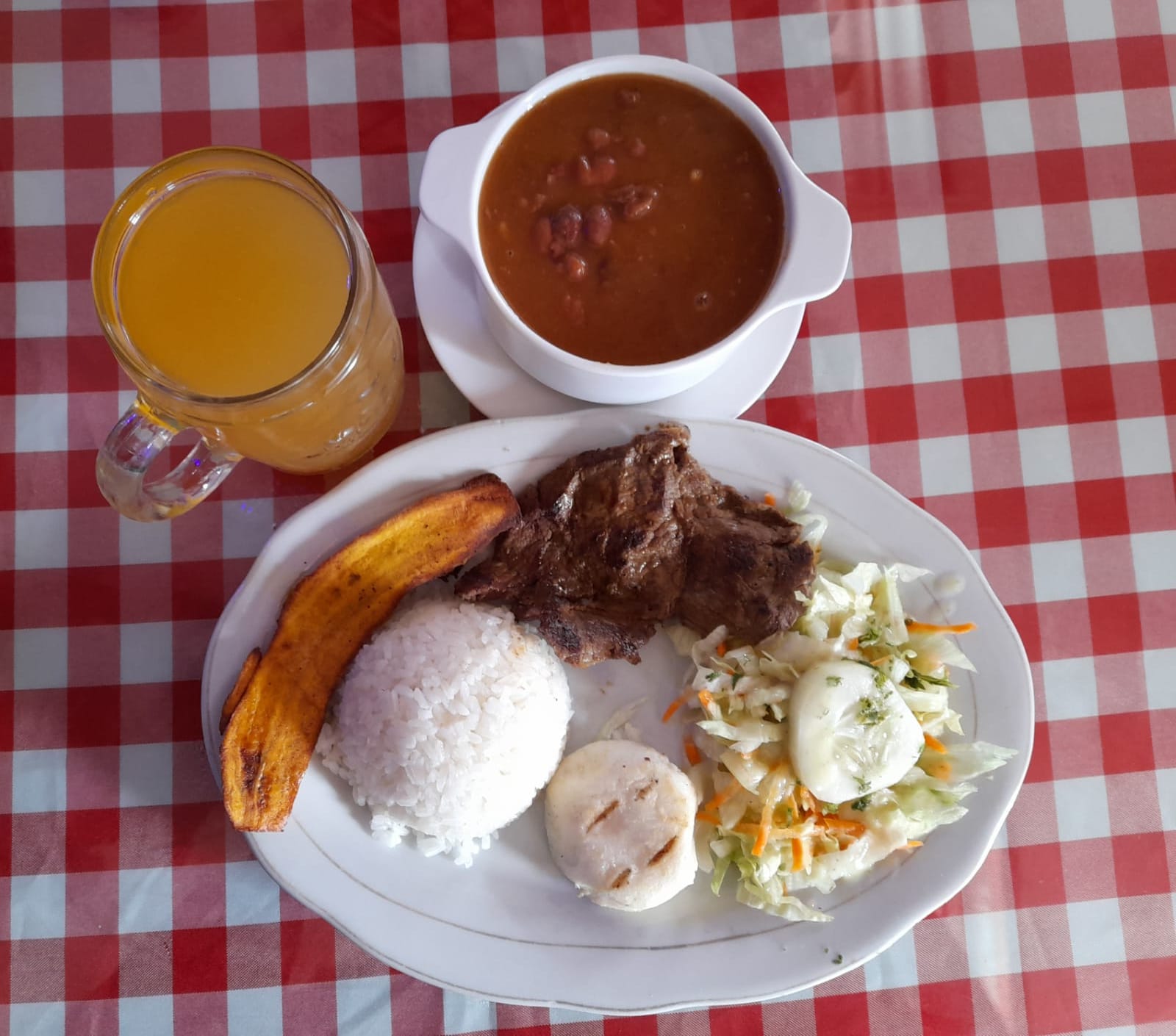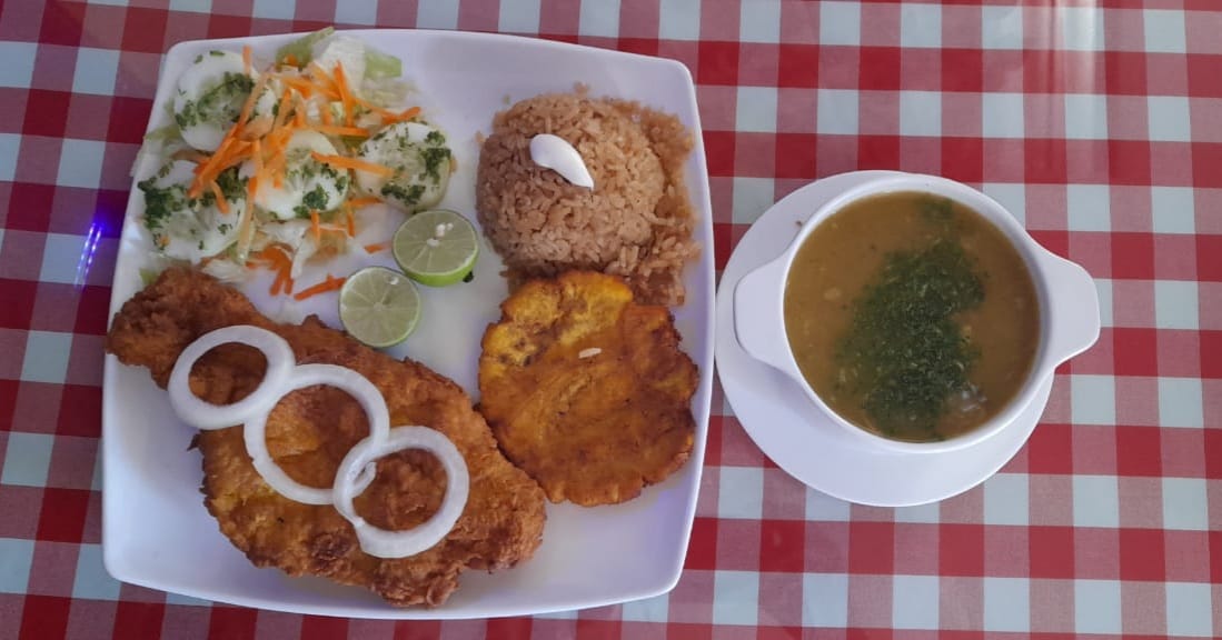 Arroz, ensalada, tajada de maduro, arepa, carne, sopa y bebida a elección.