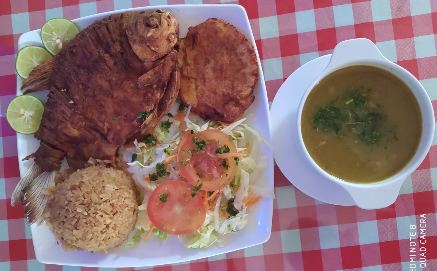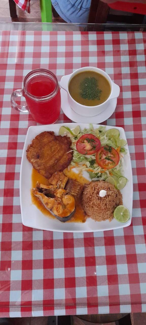 Acompañado de arroz a elección, patacón, ensalada, sopa y jugo.