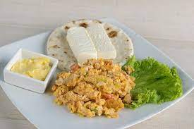 Arepa, quesito, chocolate, huevo revuelto con aliños.