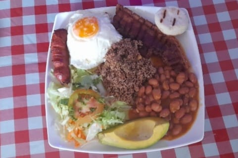 Arroz, fríjoles, arepa, aguacate, chicharrón, huevo, carne molida, chorizo, tajada de maduro.