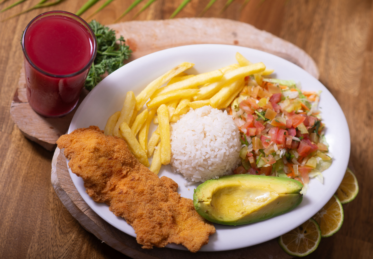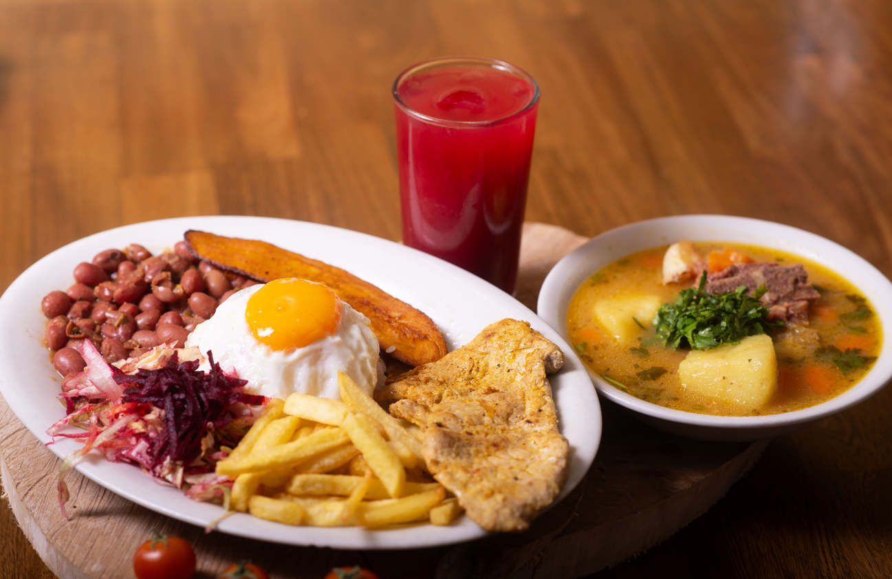 Proteína a elección, Sopa del día , Arroz , frijoles , ensalada , Tajada , huevo frito , papas fritas ,y Jugo del día