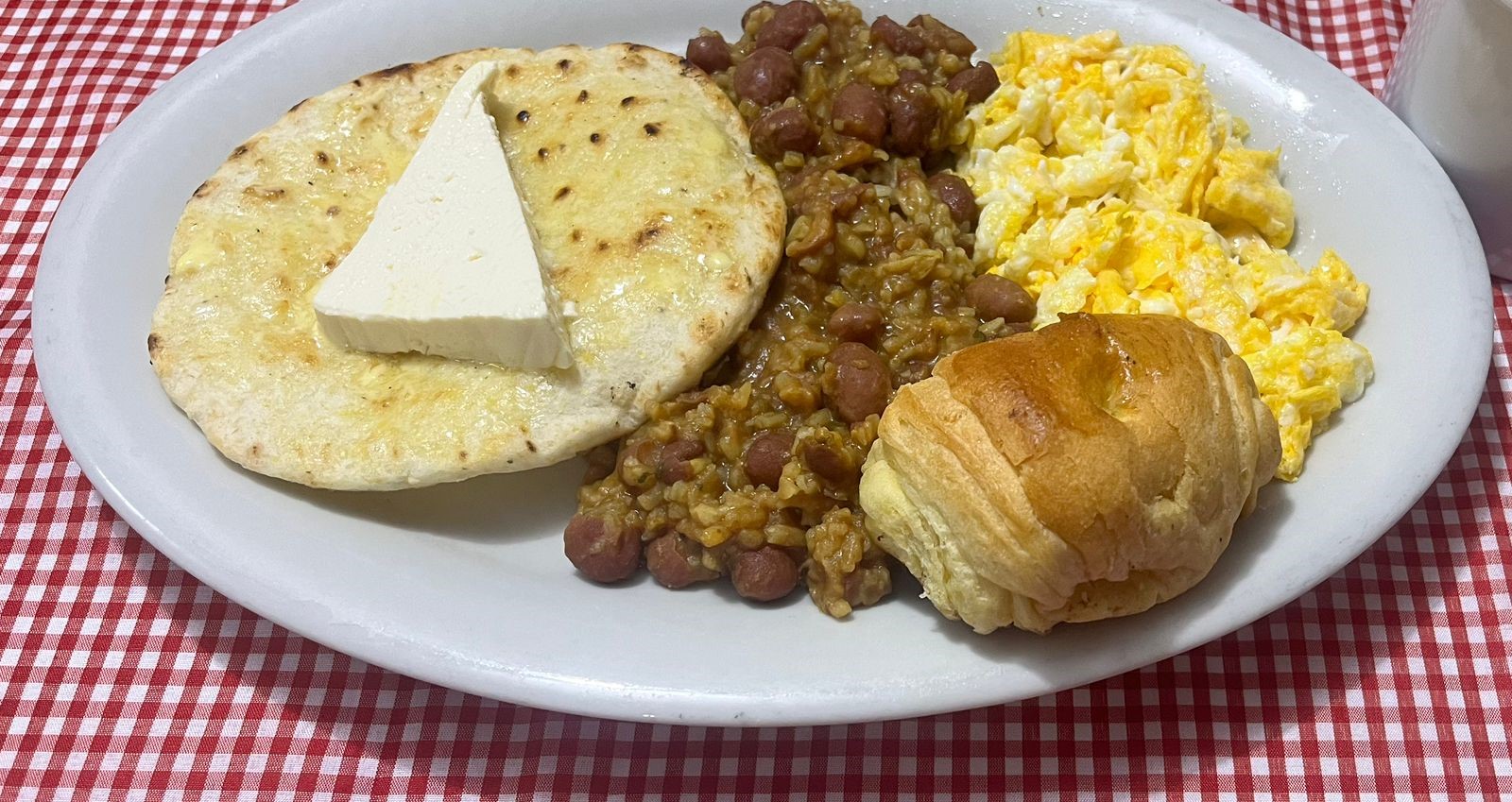 Arepa, mantequilla, quesito, huevos al gusto, frijoles con arroz, pan y chocolate
