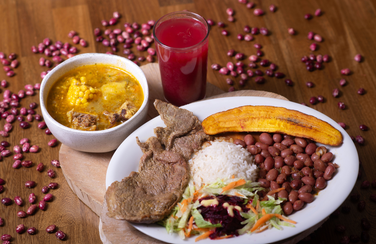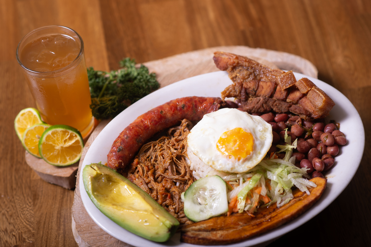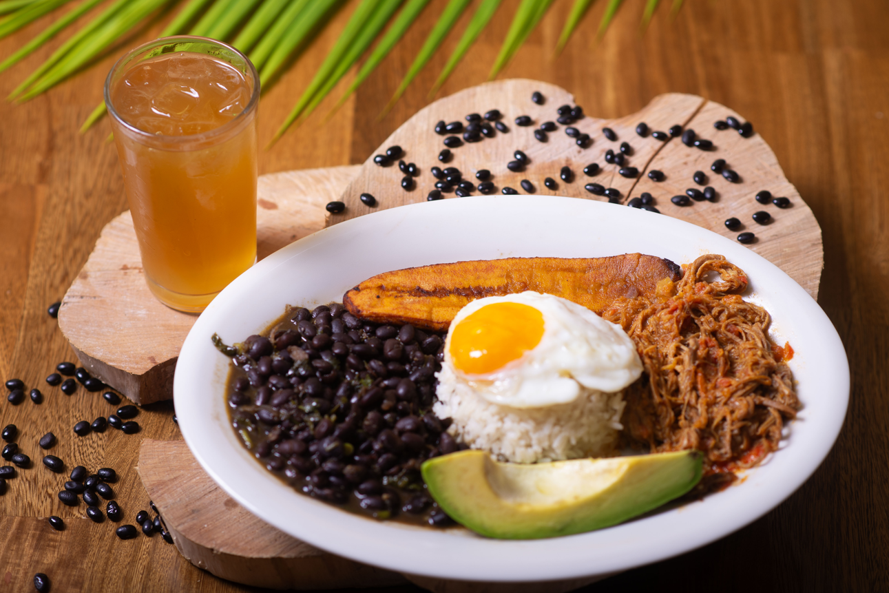 arroz, caraota, tajada de maduro, aguacate, huevo frito, carne desmechada sopa del día y jugo