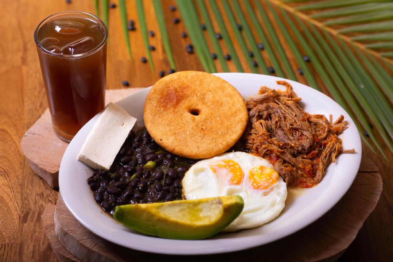 Arepa venezolana, caraota, huevo entero ,carne desmechada , queso y bebida