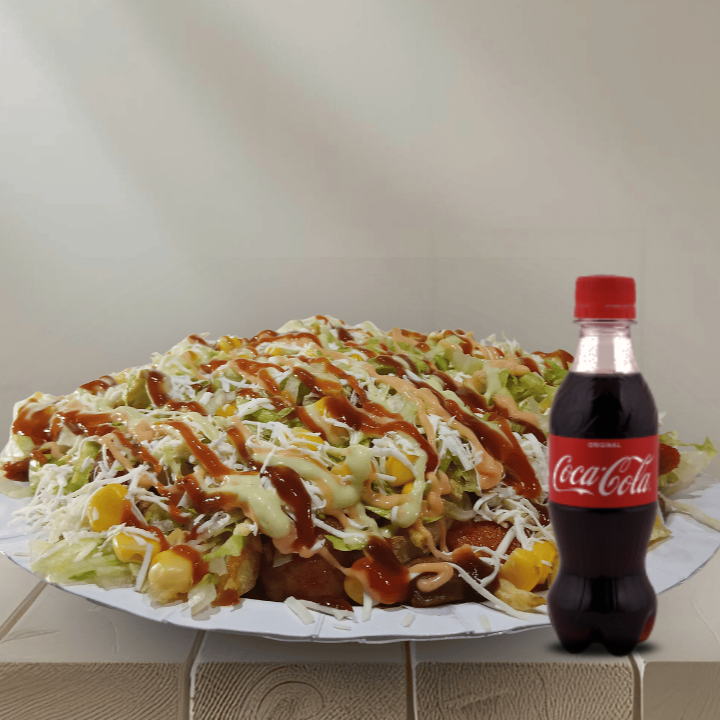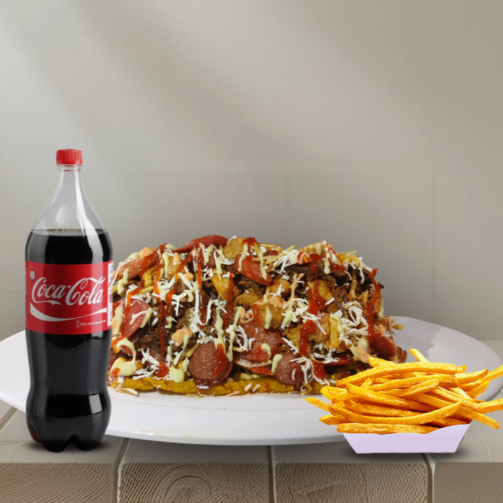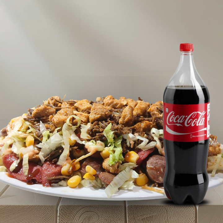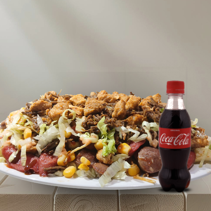 CocaCola 1L + 600g de papas, 120g de pechuga, carnes de res desmechada, 150g de carne de cerdo, 1 chorizo, 2 butifarras, 150g de queso costeño, papa ripio, lechuga, 60g de salchicha, maicitos, salsas: de la casa, (tártara), tomate, rosada, BBQ y piña.