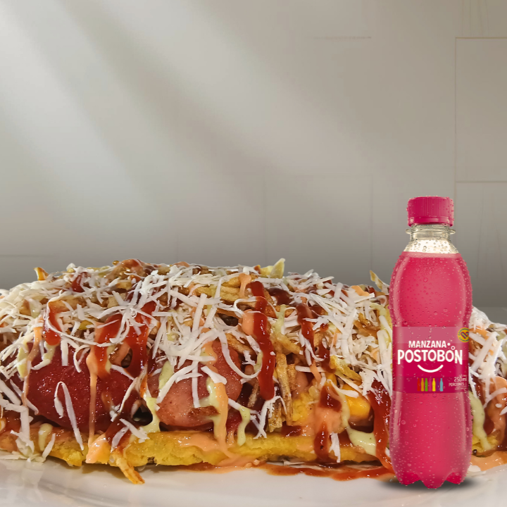 Manzana Postobón 250ml + Patacón, 60g de salchicha, 1 chorizo, 2 butifarras, 120g de queso costeño, maicitos, papa ripio, salsas: de la casa, tomate, rosada, BBQ y piña.