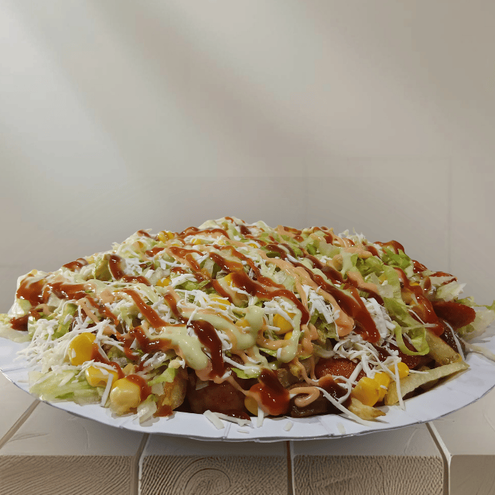 200g de papa a la francesa, 120g de salchicha, lechuga, papa ripio, salsas, 100g de queso