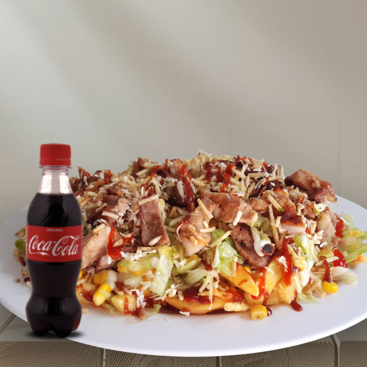 CocaCola 250ml + 200g de papas, 80g de pechuga, carne de res desmechada, 120g de carne de cerdo, 1 chorizo, 2 butifarra, 120g de queso costeño, papa ripio, lechuga, salchicha, maicitos y salsas.