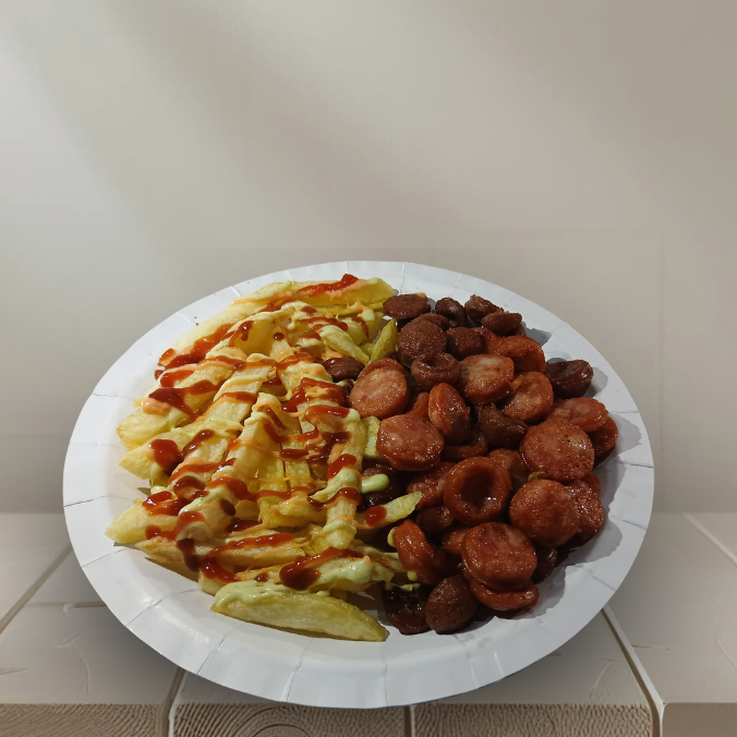 1000g de papas a la francesa, 120g de salchicha, 2 chorizo, 4 butifarra, 180g de queso costeño, lechuga, maicitos, papa ripio y salsas