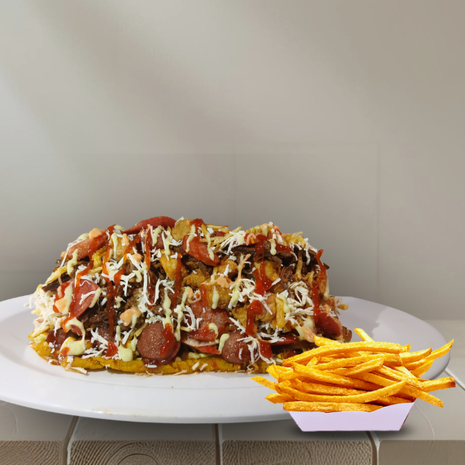 Papas a la francesa + Patacón, 120g de carne de cerdo, carne de res desmechada, 120g de pechuga, 60g de salchicha, 1 chorizo, 2 butifarras, 120g de queso costeño, maicitos, papa ripio, salsas: de la casa, tomate, rosada, BBQ y piña.