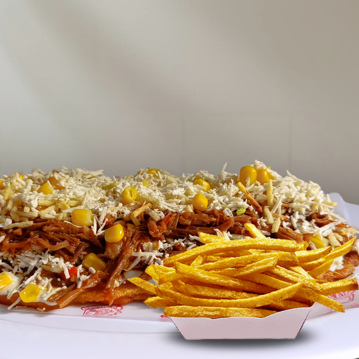 Papas a la francesa + Patacón, 250g de carne desmechada, 120g de queso costeño, maicitos, papa ripio y salsas.