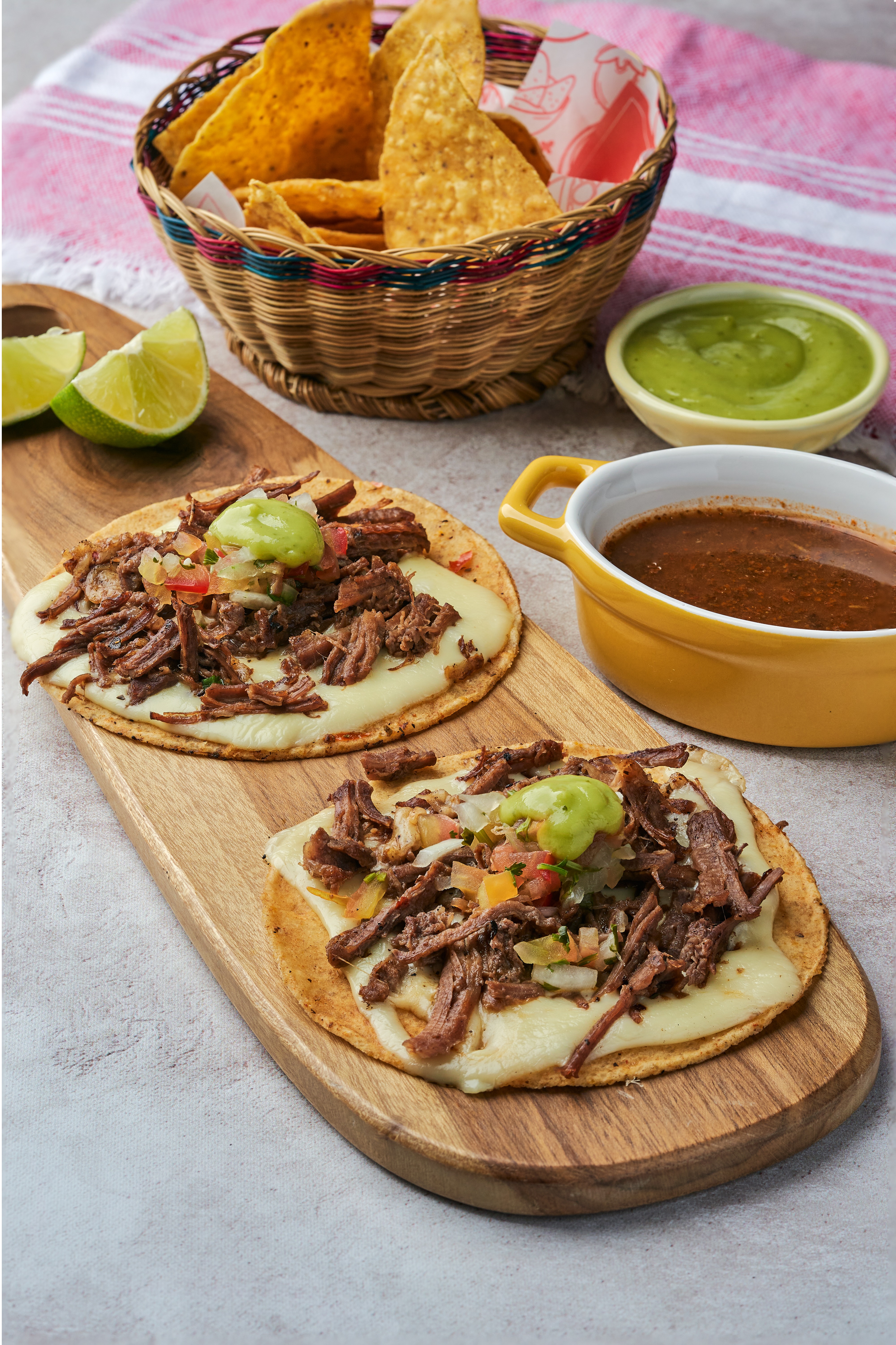 2 tacos blandos con carne de birria, especias mexicanas con picante suave, queso y pico de gallo. Acompañado de nachos, guacamoles y sour cream.