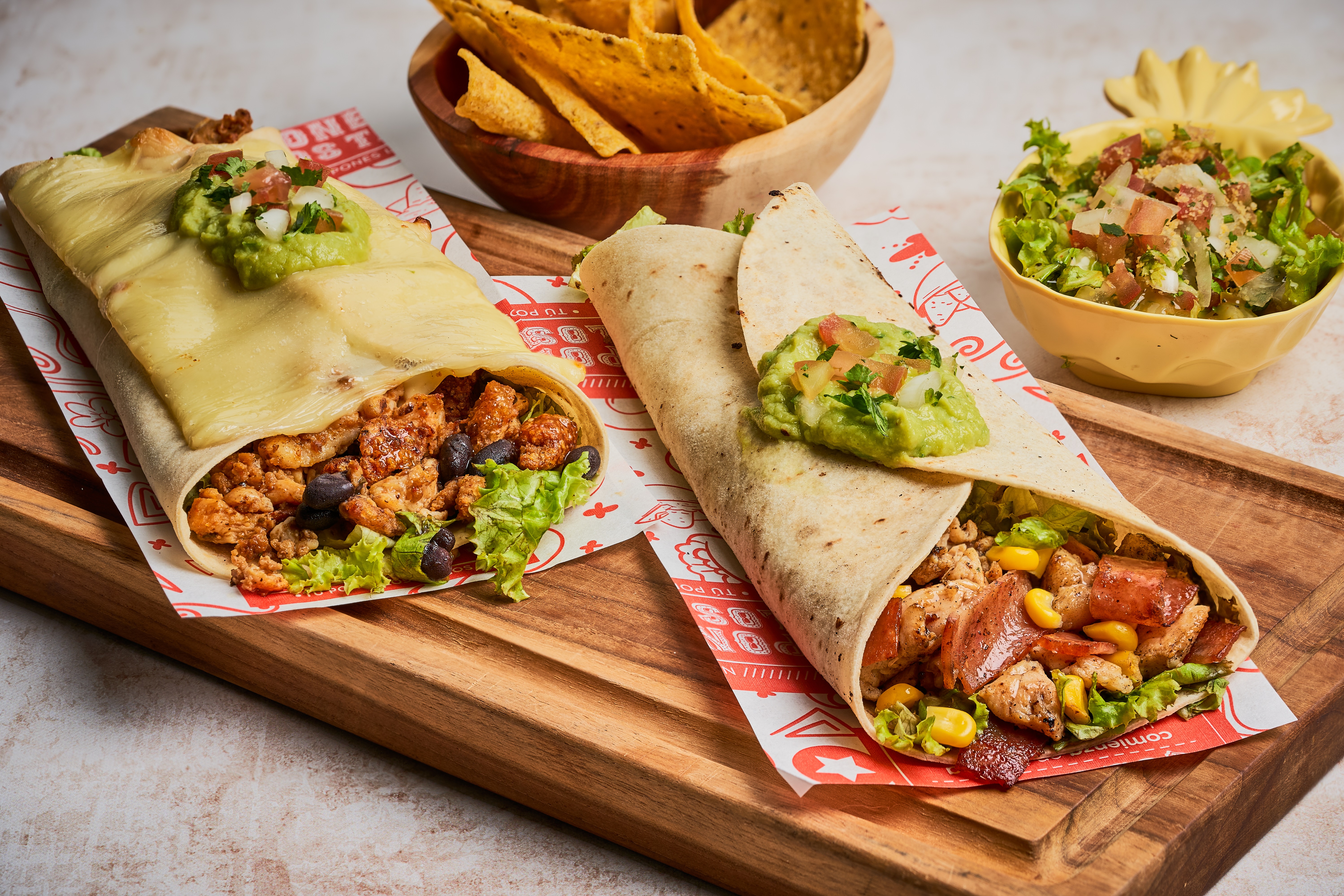Tortilla de harina, pollo, carne, chicharrón, frijol refrito, lechuga, guacamole, sour cream. Más Acompañante