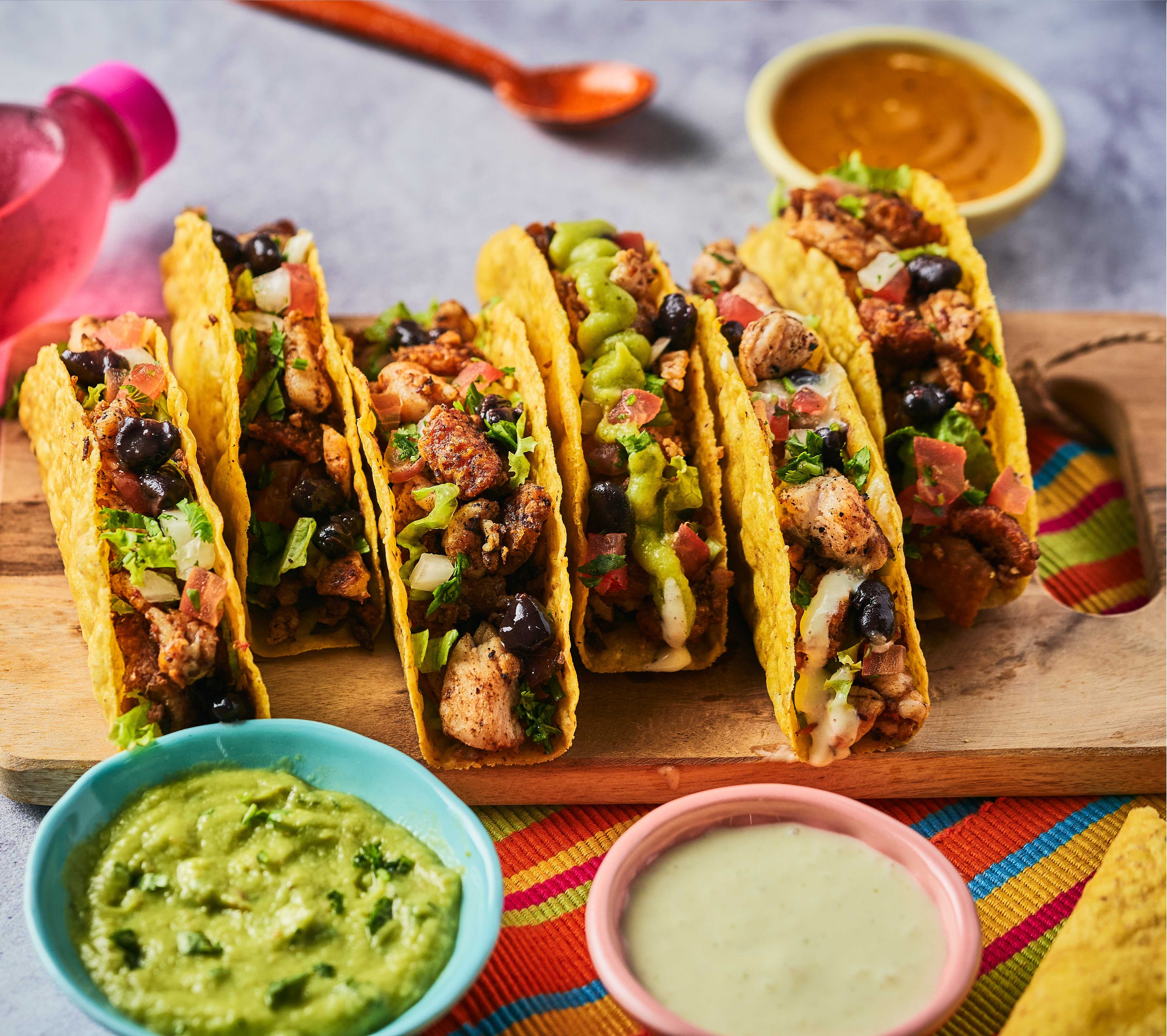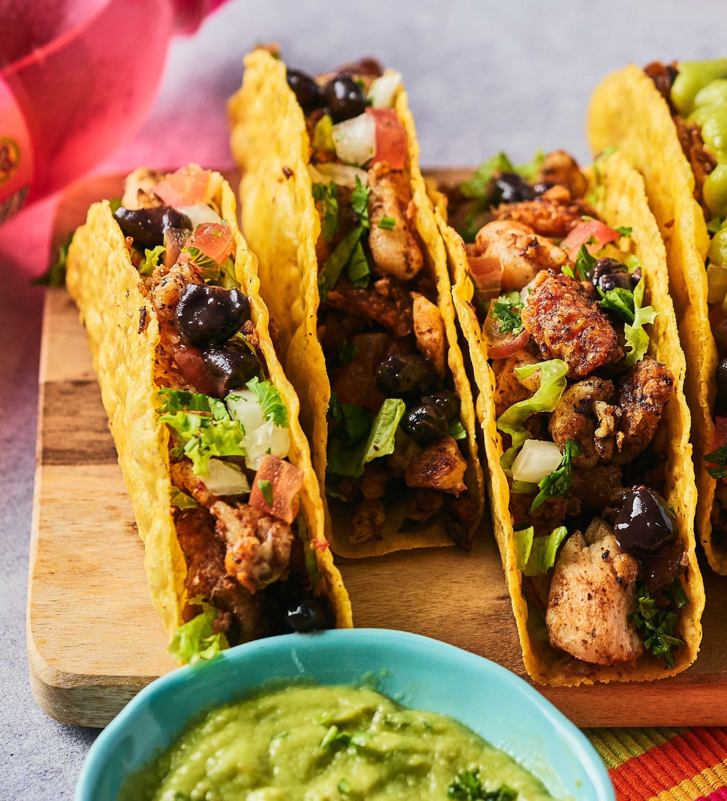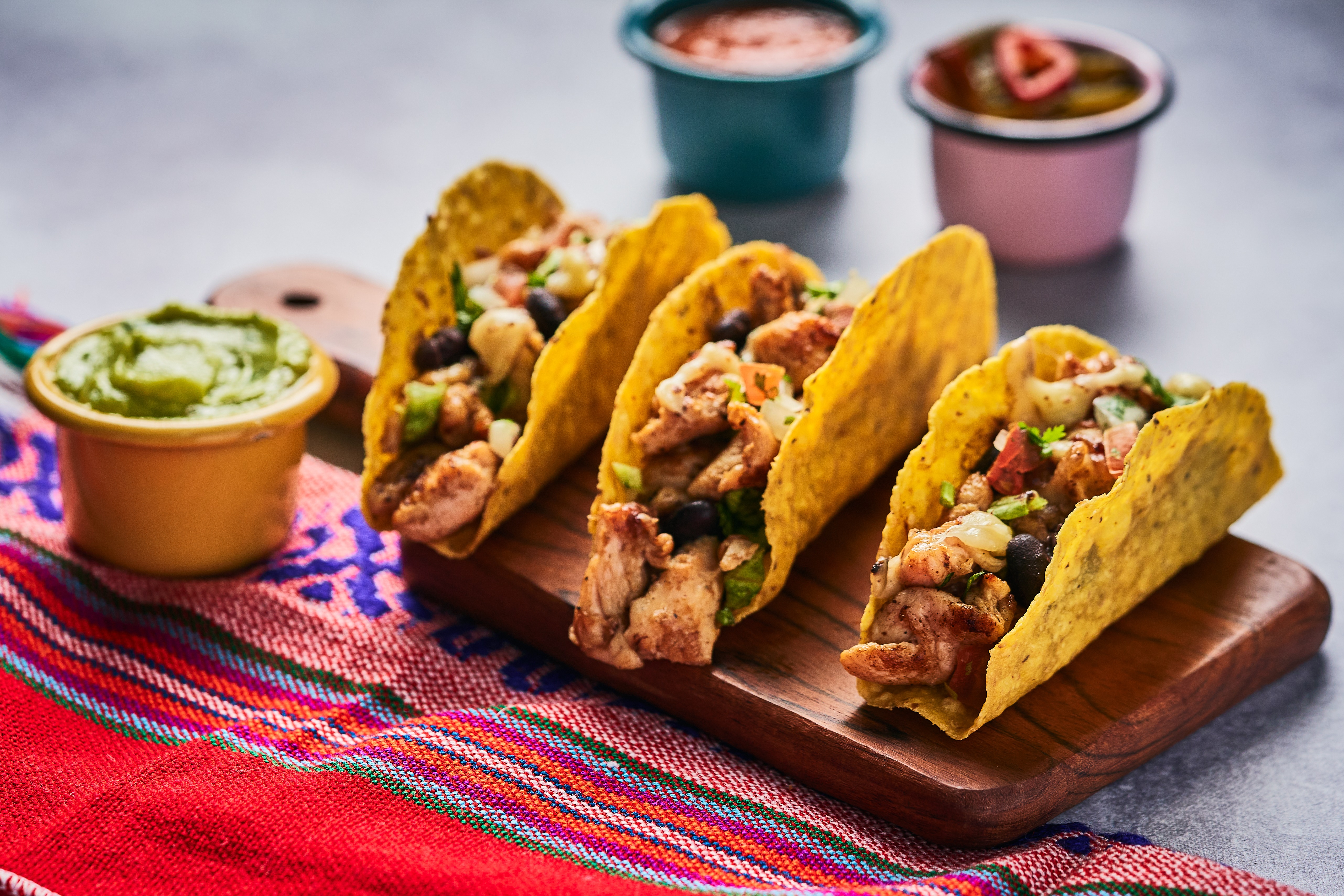3 tacos con pollo, queso, frijol refrito, lechuga, guacamole, sour cream y pico de gallo.
