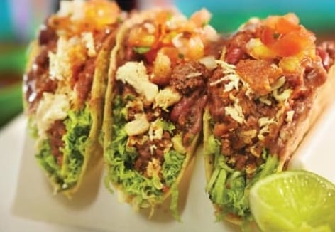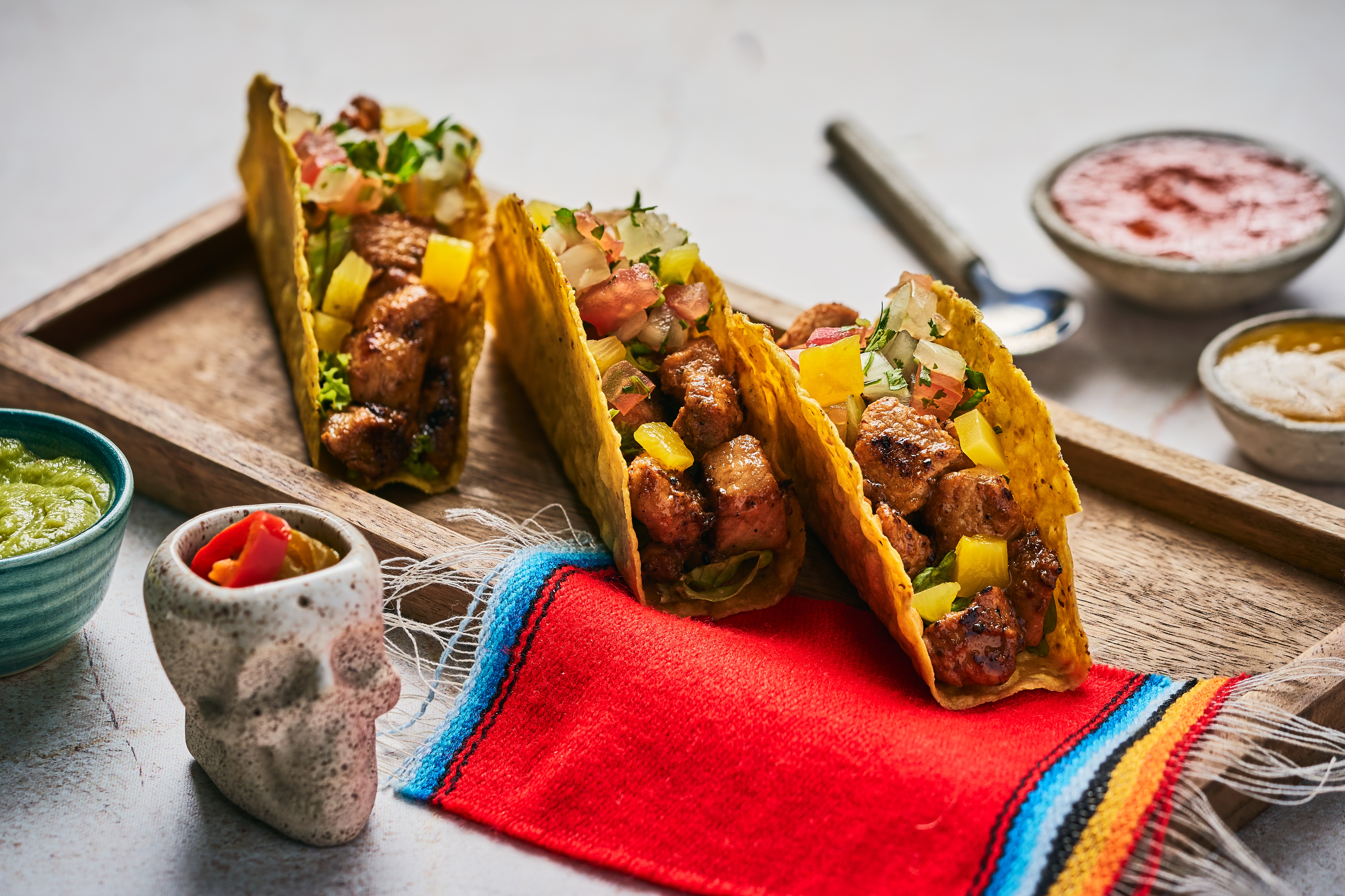 3 Tacos de carne de cerdo, piña asada, frijol refrito, lechuga, guacamole, sour cream y pico de gallo.
