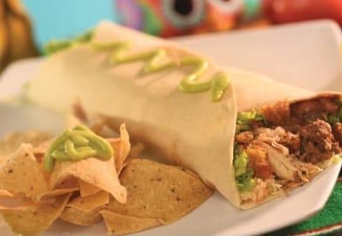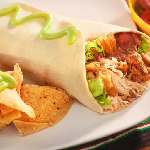 Tortilla de harina, pollo, carne, chicharrón, frijol refrito, lechuga, guacamole, sour cream más acompañante.