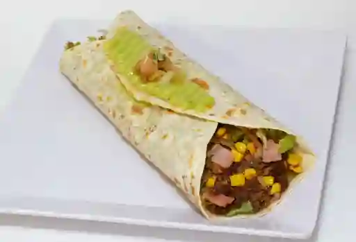 Tortilla de harina con carne desmechada, maicitos dulces, queso, guacamole, sour cream más acompañante.
