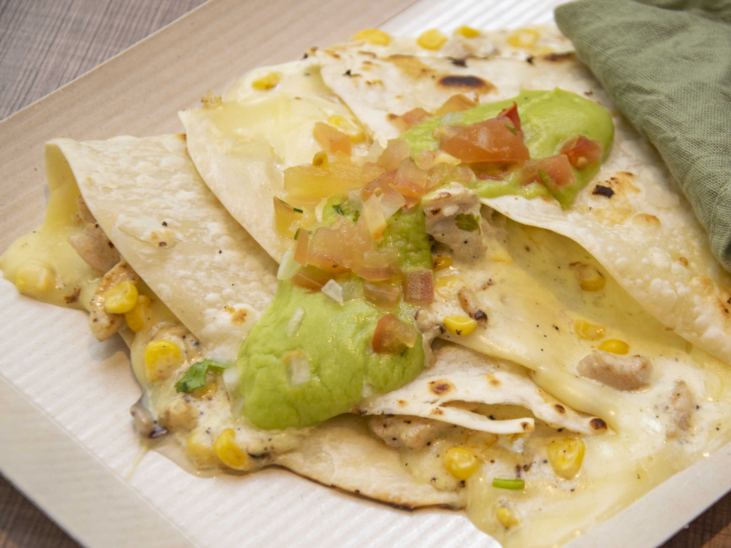 Tortilla de harina con pollo, maicitos dulces, queso, guacamole, sour cream más acompañante.
