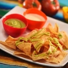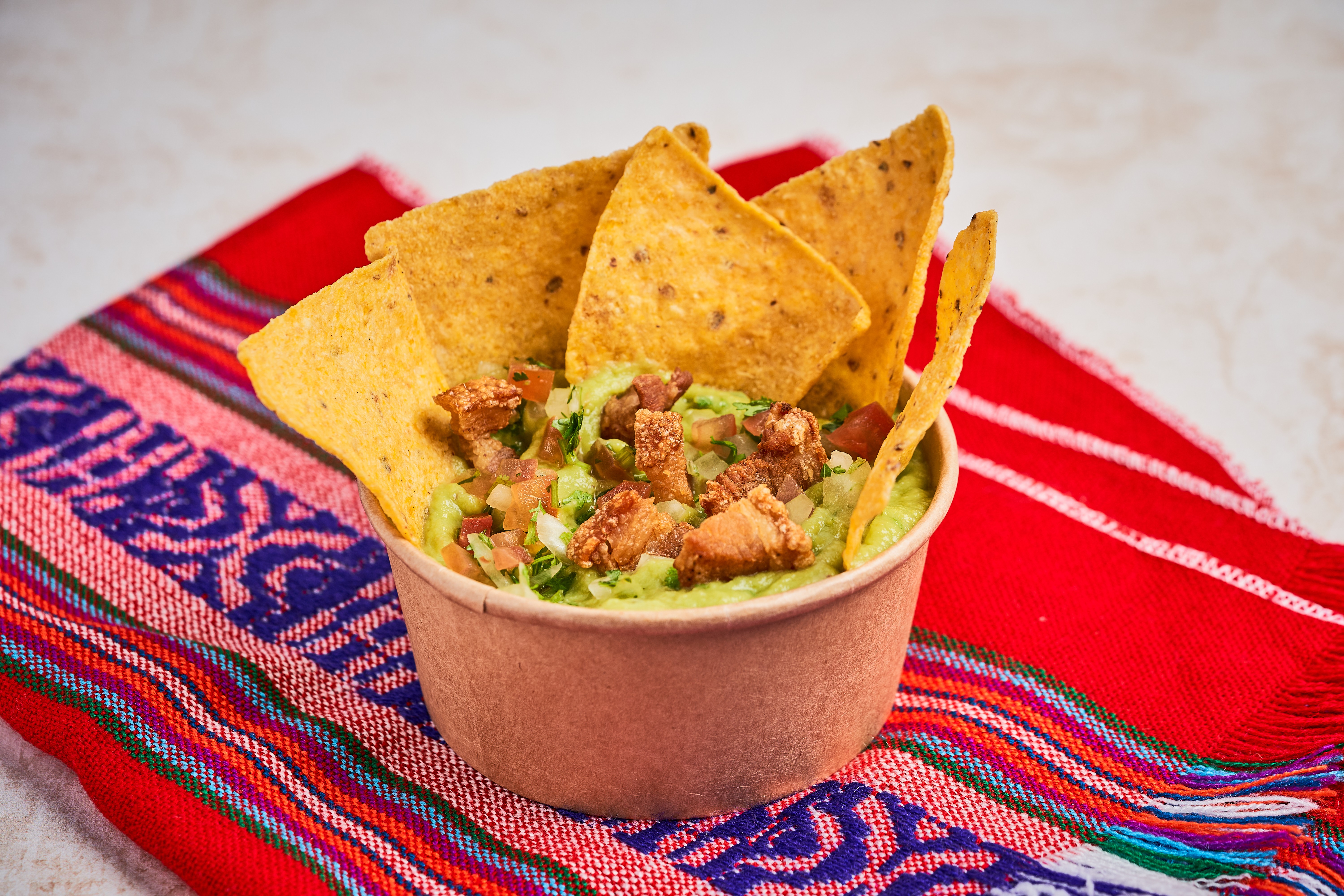 Guacamole cremoso, nachos, chicharrón carnudo y pico de gallo.