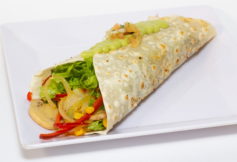 Tortilla de harina, champiñones salteados, maicitos dulces, pimentón, cebolla, queso, frijol refrito, lechuga, guacamole, sour cream más acompañante.