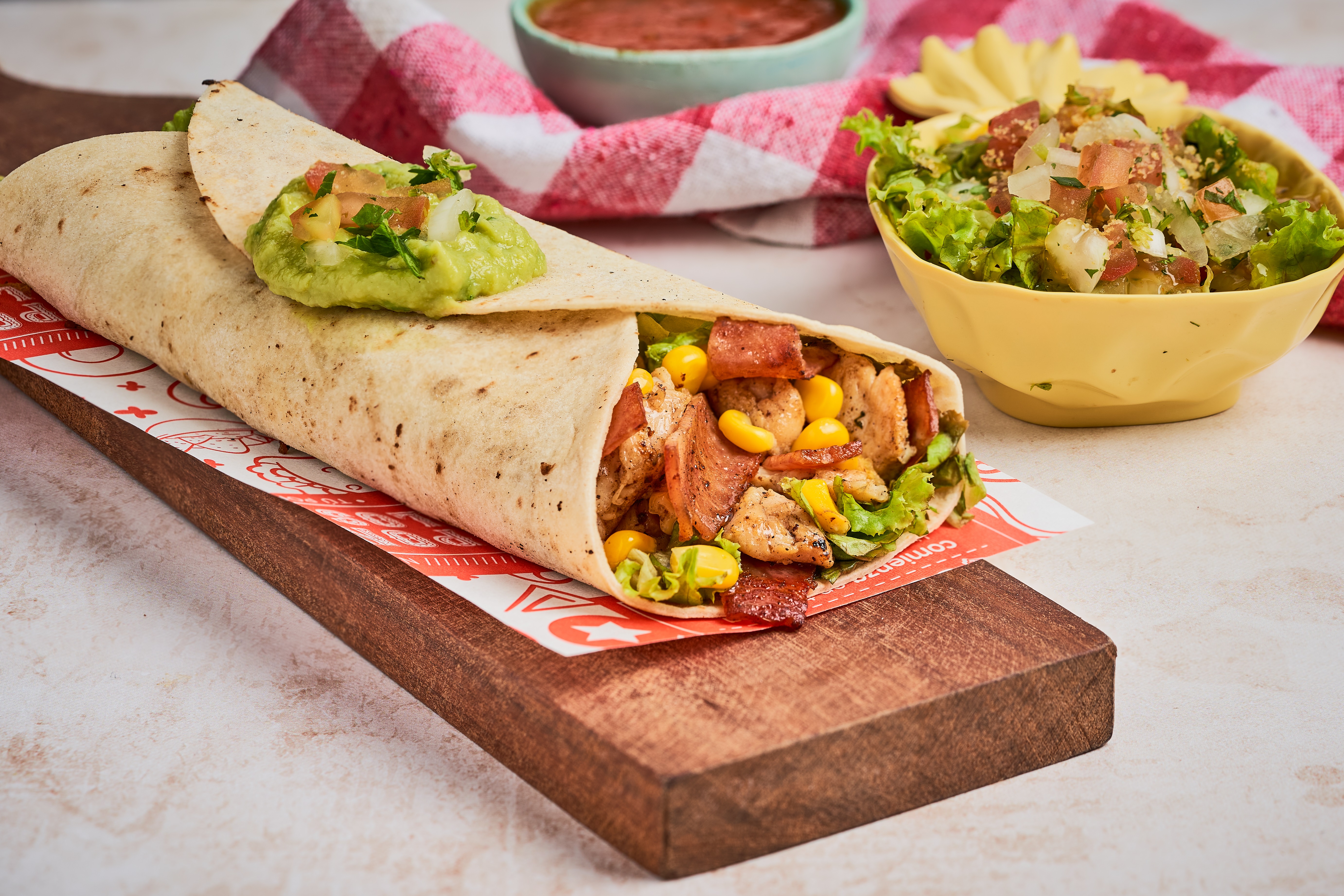 Tortilla de harina, pollo, maicitos dulces, tocineta, pico de gallo, queso, frijol refrito, guacamole, lechuga, sour cream más acompañante.