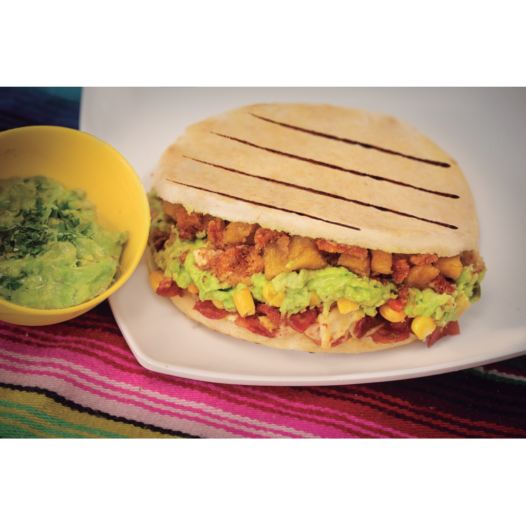 Tortilla de harina, carne, chicharrón, maicitos dulces, madurito, queso, frijol refrito, guacamole, sour cream, lechuga más Acompañante