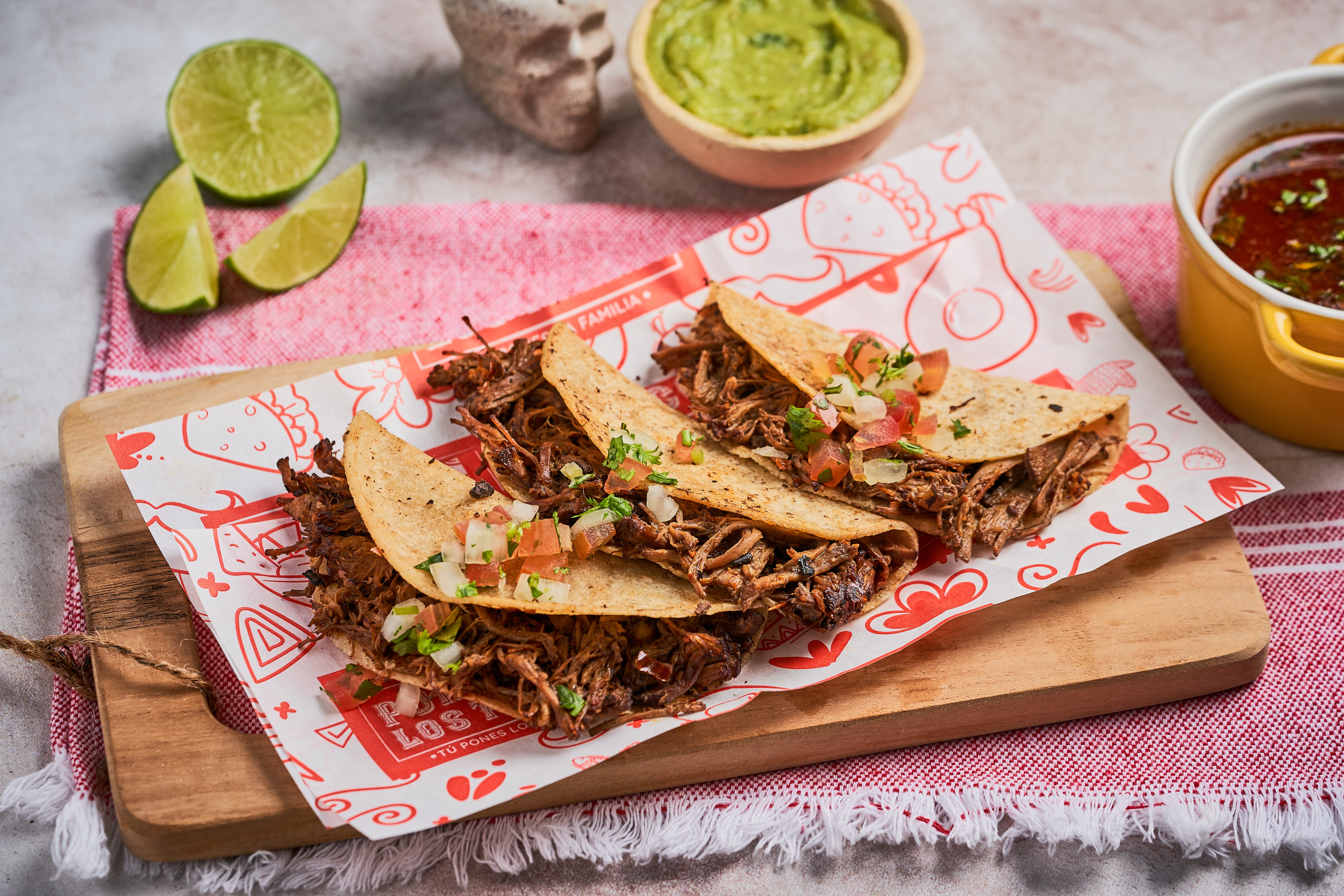 3 Tortillas de maíz crujientes con carne desmechada, frijol refrito, lechuga, guacamole, sour cream, pico de gallo.