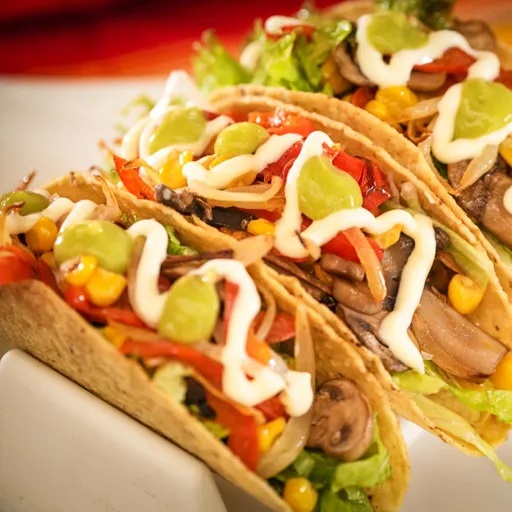 Tortilla de maíz crujiente con champiñones, maicitos, pimentón, cebolla, frijol refrito, lechuga, guacamole, sour cream, pico de gallo.