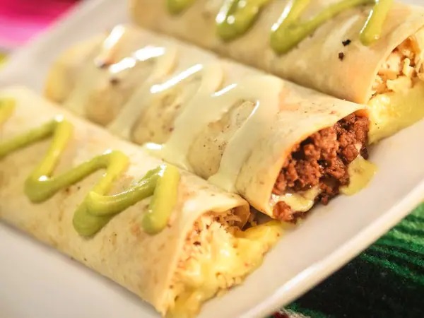 3 Deliciosas tortillas de harina rellenas de queso, pollo, carne molida con guacamole y sour cream.