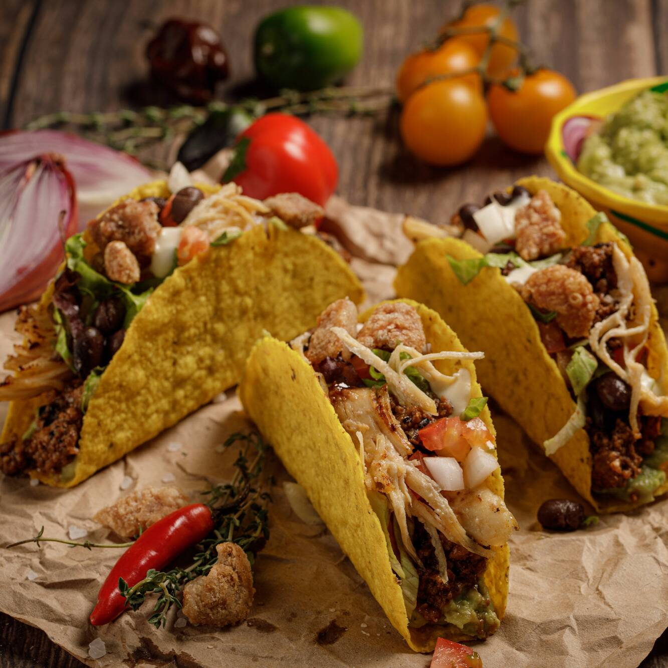 3 Tortillas de maíz crujientes con pollo, carne, chicharrón, frijol refrito, lechuga, guacamole, sour cream, pico de gallo.