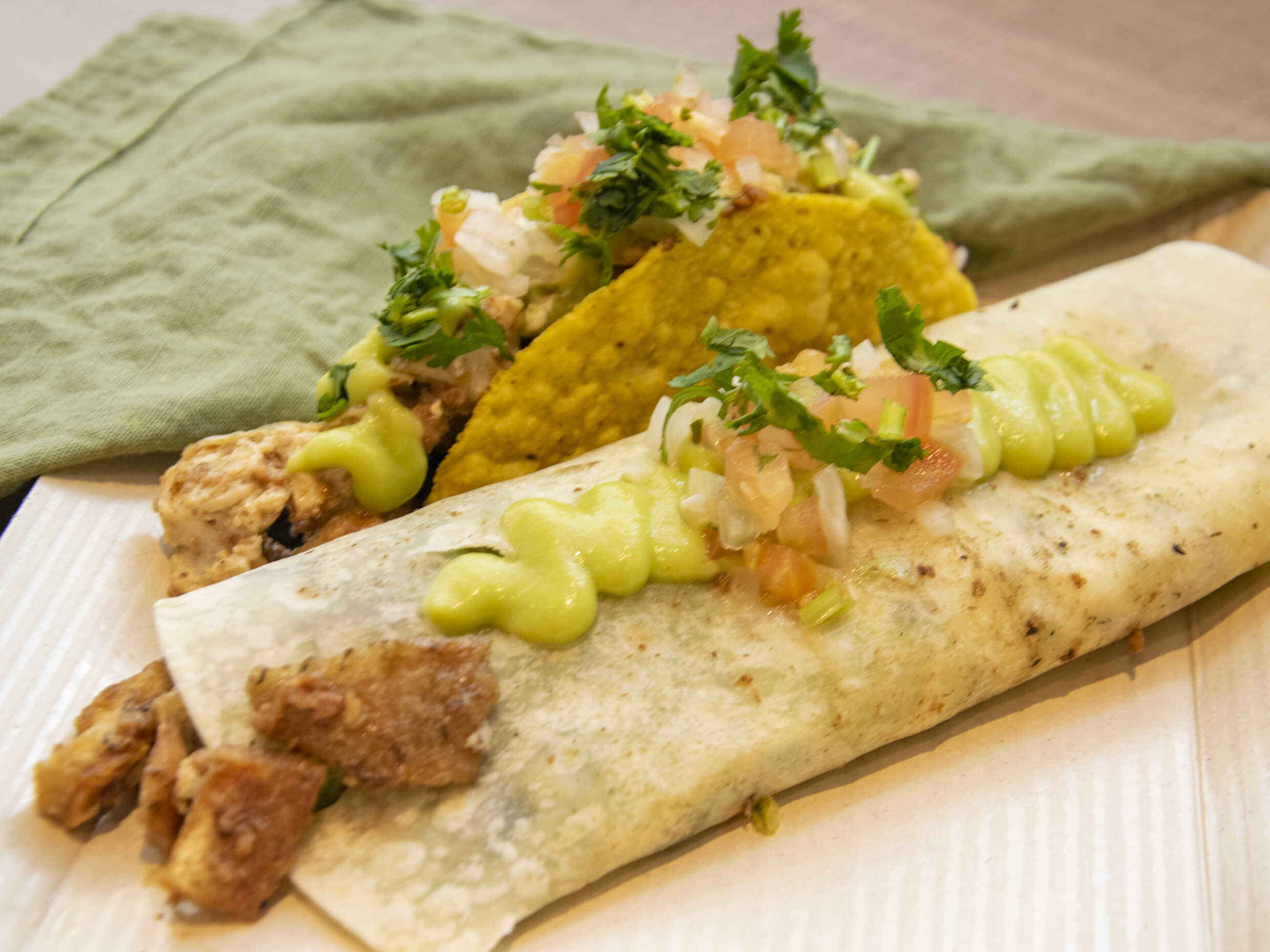 Tortilla de harina, pollo al pastor, piña asada, frijol refrito, lechuga, guacamole y sour cream.
