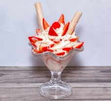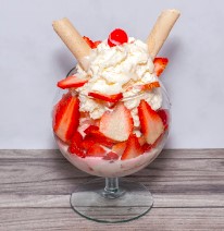 Fresas con salsa lecherita, barquillos, cereza, chantilly y 2 bolas de helado, sabores a elegir.