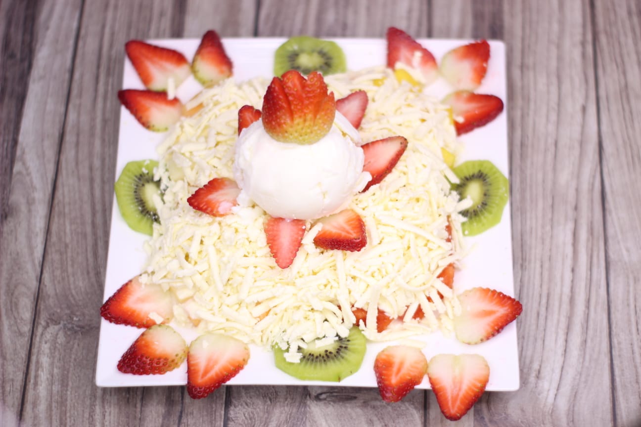 Ensalada con una bola de helado de vainilla light, mango, manzana, melón, papaya, fresas, kiwi, queso rallado y crema de leche.
