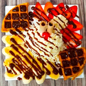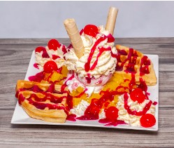 Waffle con una bola de helado de chocolate, banano, fresas, queso rallado, salsa de chocolate, barquillos, cereza y chantilly.