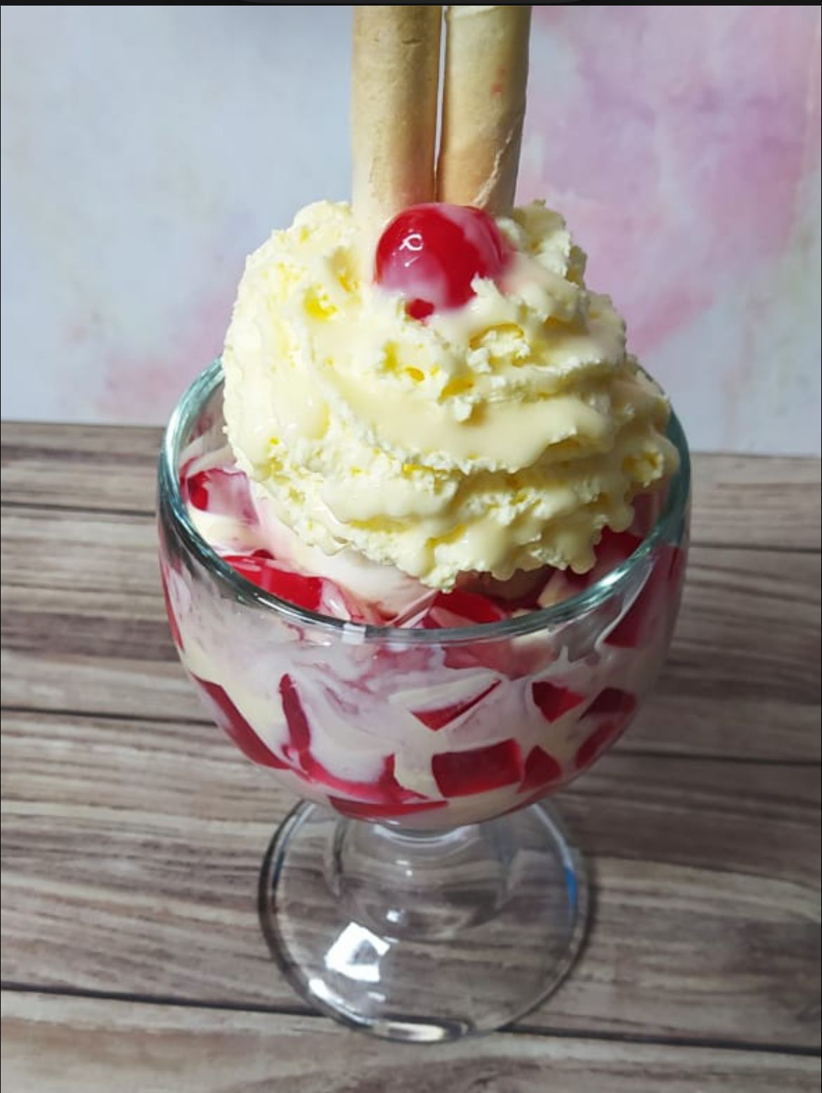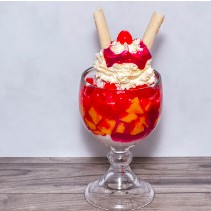 Gelatina con 2 bolas de helado de vainilla, salsa lecherita, crema de leche, barquillos, cereza y chantilly.
