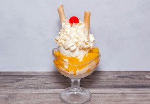 Copa con 2 bolas de helado de vainilla, duraznos, salsa lecherita, barquillos, cereza y chantilly.