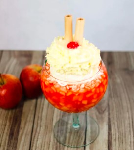 Salpicón con una bola de helado de vainilla, crispy blanco, salsa lecherita, barquillos, cereza y chantilly 24 oz.