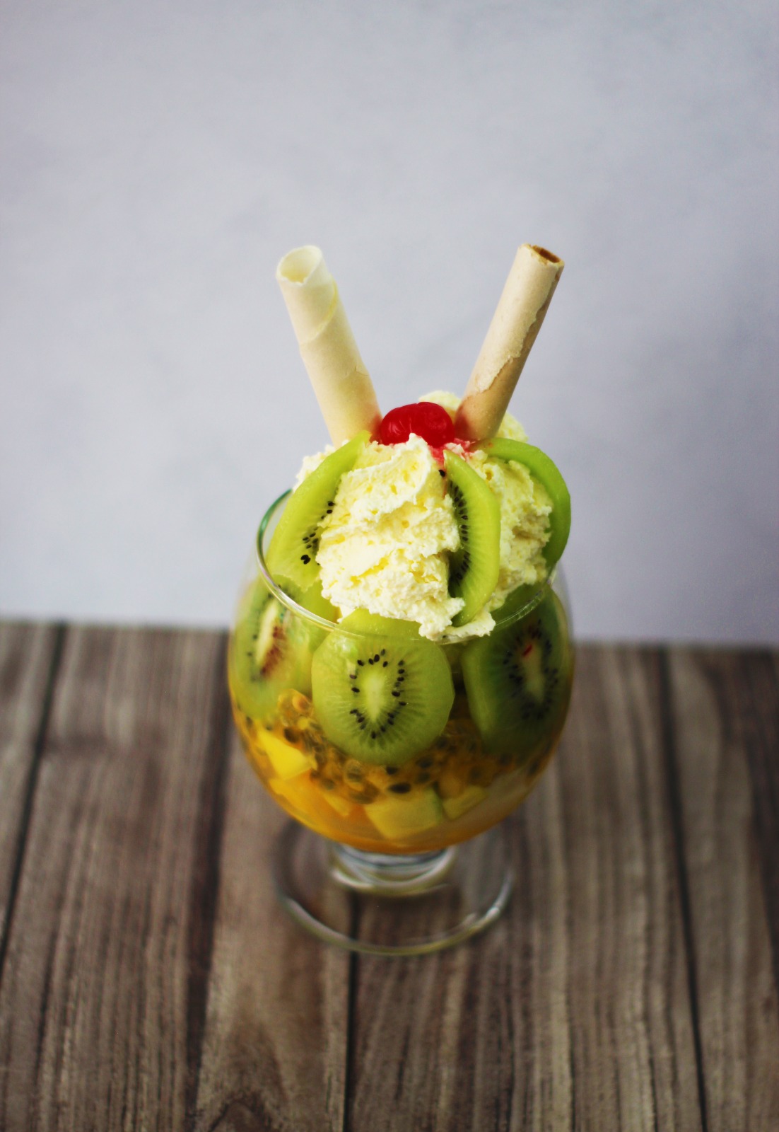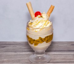 Copa con kiwi, mango, barquillo, cereza, chantilly, 2 bolas de helado vainilla, arequipe y pulpa de maracuyá.