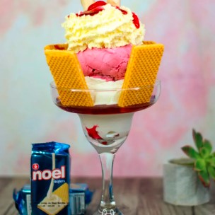 Copa con 2 bolas de helado, sabores a elegir, galleta wafer, salsa de mora, barquillos, cereza y chantilly.