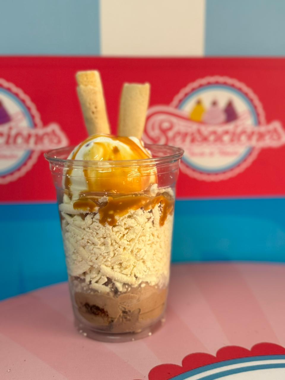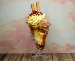 Copa con 3 bolas de helado sabores a elegir, barquillos, cereza, chantilly, salsa de arequipe y chocolate.
