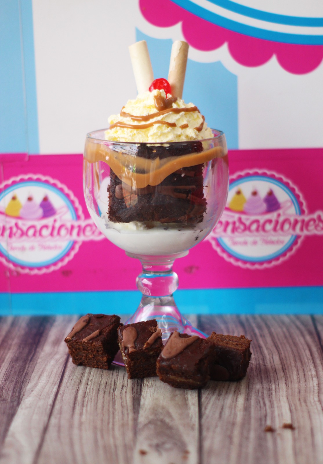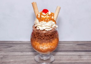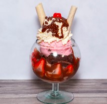 Copa con 2 bolas de helado sabores a elegir, torta brownie, fresas, salsa de chocolate, barquillos, cereza y chantilly.
