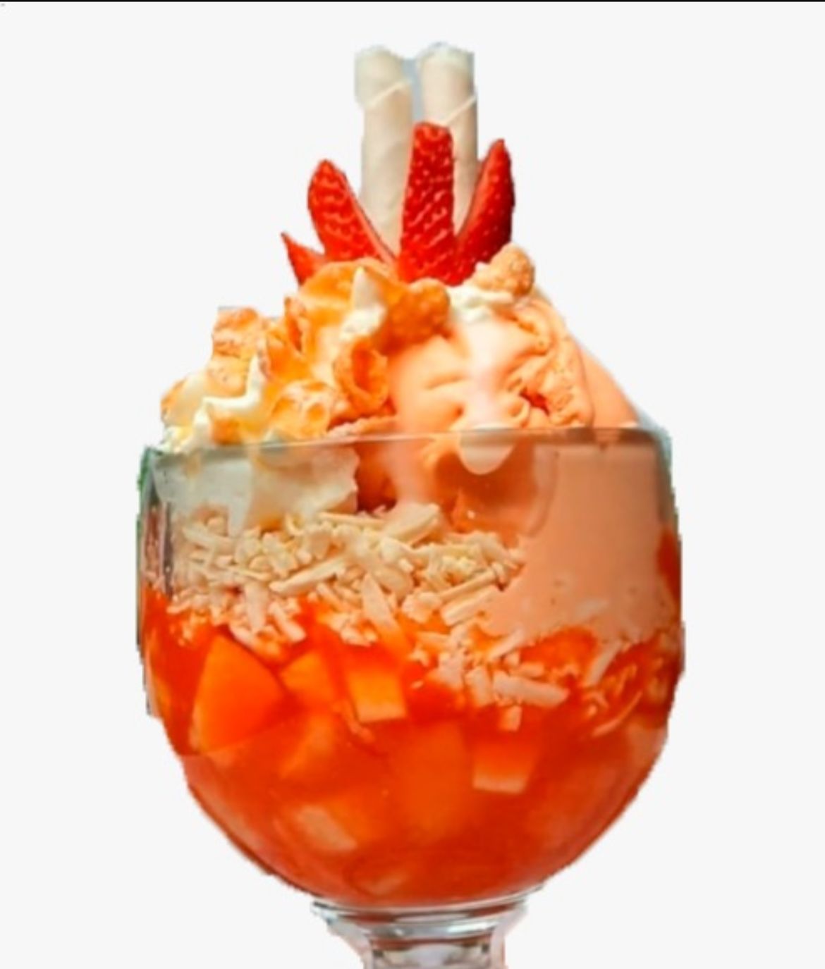 1 Bola de helado de vainilla con mango, manzana, melón, fresas, banano, gelatina, yogurt natural, barquillos y cereza.