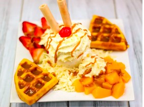 Waffle con una bola de helado de caramelo, duraznos, fresas, salsa de arequipe, queso rallado, barquillos, cereza y chantilly.